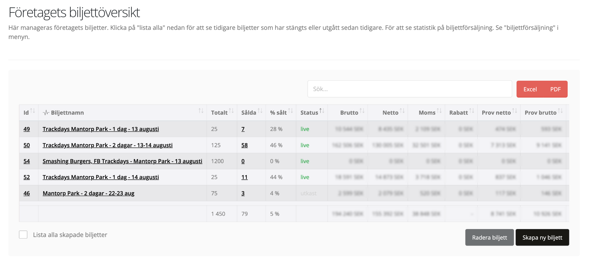 För att snabbt få en sammanställning av hur många biljetter som finns respektive hur många biljetter som är sålda per event så används denna sida. Du kan också använda den för ekonomiskt värde så du snabbt ser hur mycket eller lite pengar som kommer in för att inte riskera att ligga ute med pengar eller köpa/boka något som det inte blir ekonomisk täckning på. Även här kan du exportera informationen i Excel eller PDF-format.