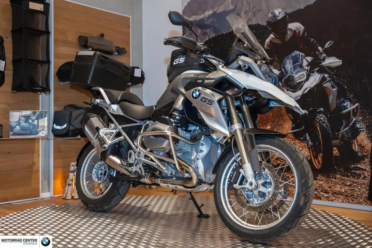 Alpinvit, Nya däck kommer monteras vid försäljning, Senaste service vid 855 mil 2020-10-26, ASC + driving modes, Dynamic ESA, LED headlight, Daytime running lights, On-board computer Pro, Dynamic package, Preparation navigation unit, Exhaust system chrome, Operating instructions Swedish, Heated handlebar grips, RDC, Cruise control, Hand protector, Direction indicator LED white, Case holder left/right, Cross-spoke wheels R1200GS R 1200 GS R1200 1200GS NGM773