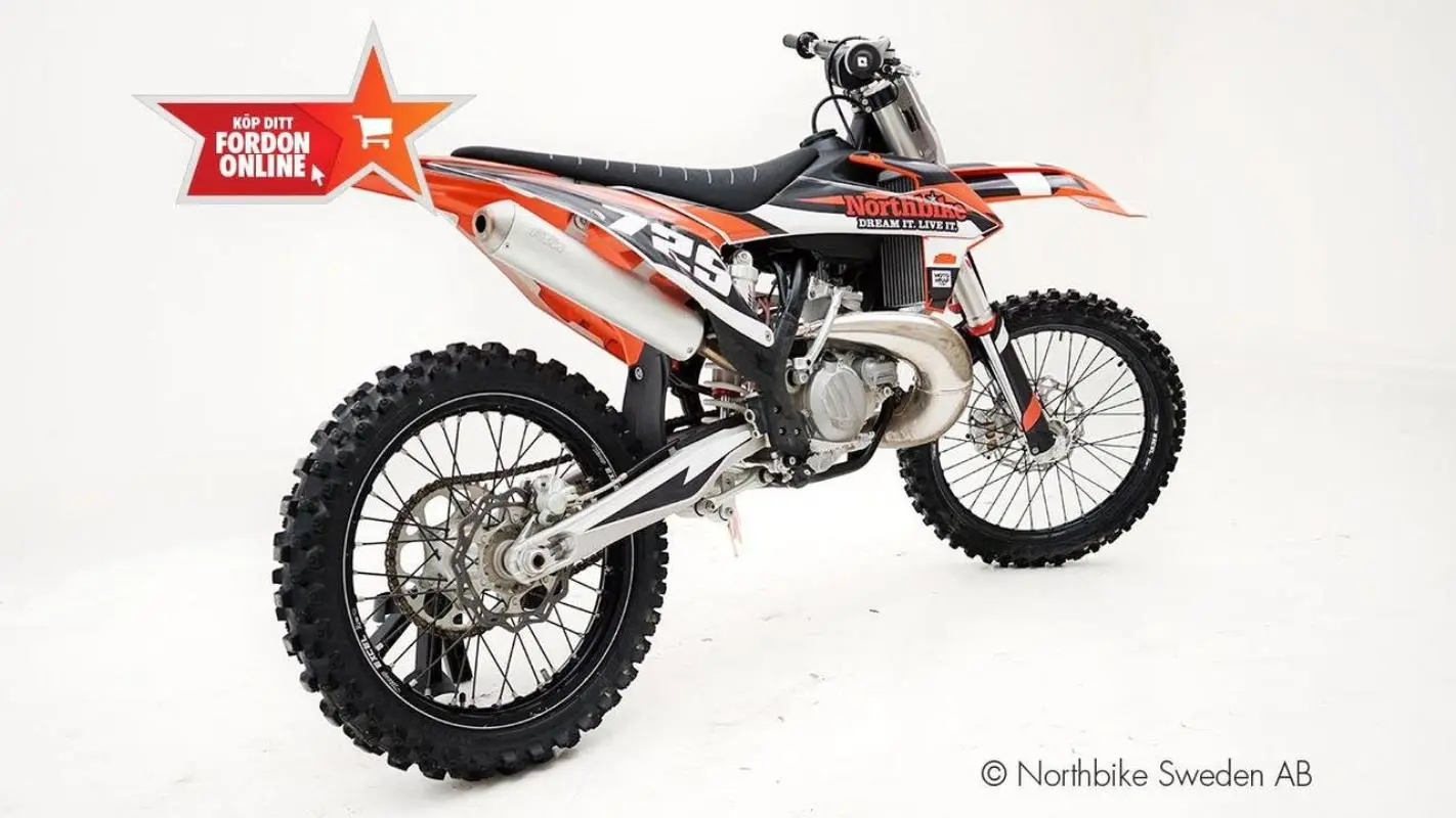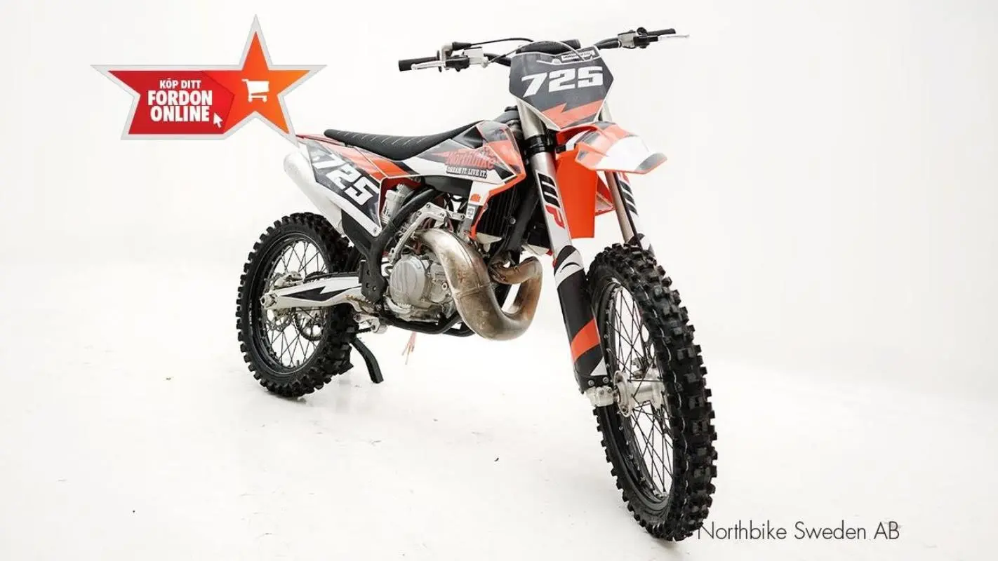 KTM 250 SX i fint skick. En riktigt rolig 2-taktare med endast 15,1 timmar som är utrustad med dekalkit. Däcken har endast gått 1,5 timmar och i samma veva byttes det till 4mm tjocka slangar.