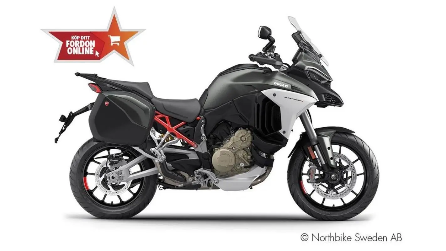 Ducati Multistrada V4S Travel & Radar. Denna populära "multi-hoj" är utrustad med: Dödavinkelvarnare, sidoväskor, Full map GPS via DucatI Connect, värmehandtag, värmesadlar, adaptiv farthållare med så mycket mera! En hoj som tack vare sina otroligt långa intervaller på ventiljusteringar (6000mil) passar utmärkt för långturerna samtidigt som den pigga V4 motorn på 170 hk och 125 Nm gör att den utmatar sporthojarna! 4 Års garanti.