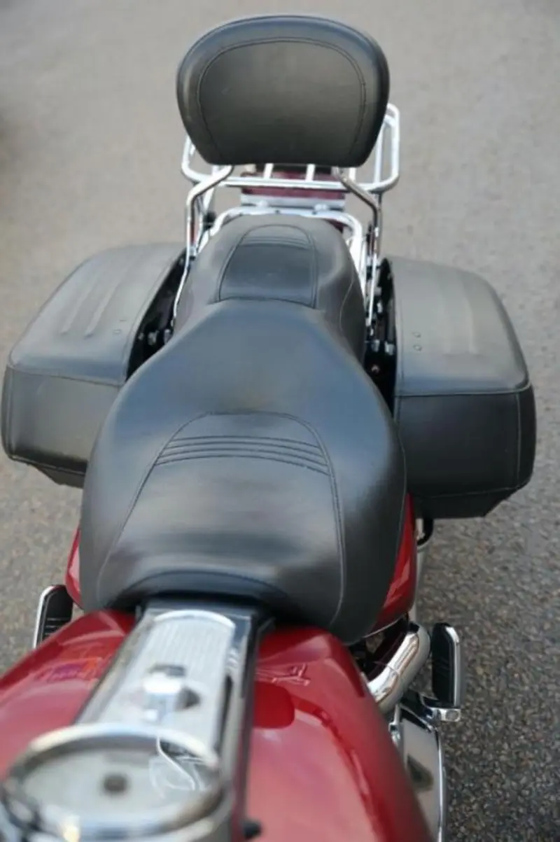 Här är en välutrustad Road King med detachable vindruta, dubbellyse verktygsväska framför styret, skinnväskor och Rinehart Racing-dämpare.