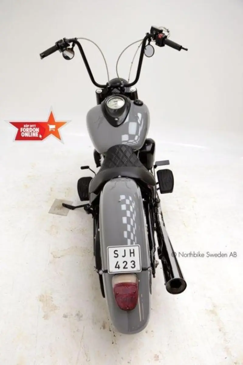 Vädligt mycket gjort på den, bl a aphängstyre, omgjorda skärmar, omlackad, ny diamond-stitch sadel, white wall däck, Vance & Hines system osv.