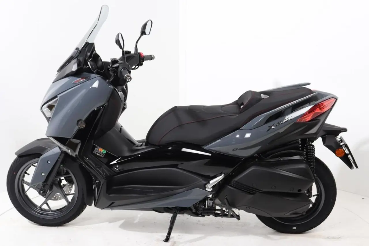 Nu har vi Yamaha X-max 300 Tech max. Bland de exklusiva Tech Max -finesserna finns en exklusiv sadel, fotstöd av aluminium och en speciell och exklusiv ytfinish på flera plastdetaljer. Och det unika paketet kompletteras med den eleganta färgnyansen Power Grey och Dark Petrol och röktonat bakljus.
