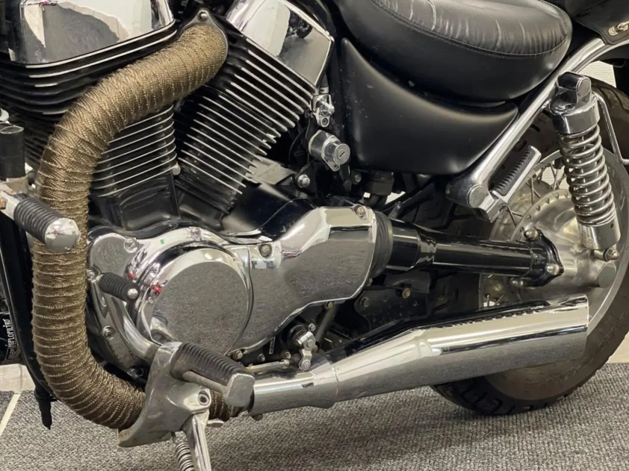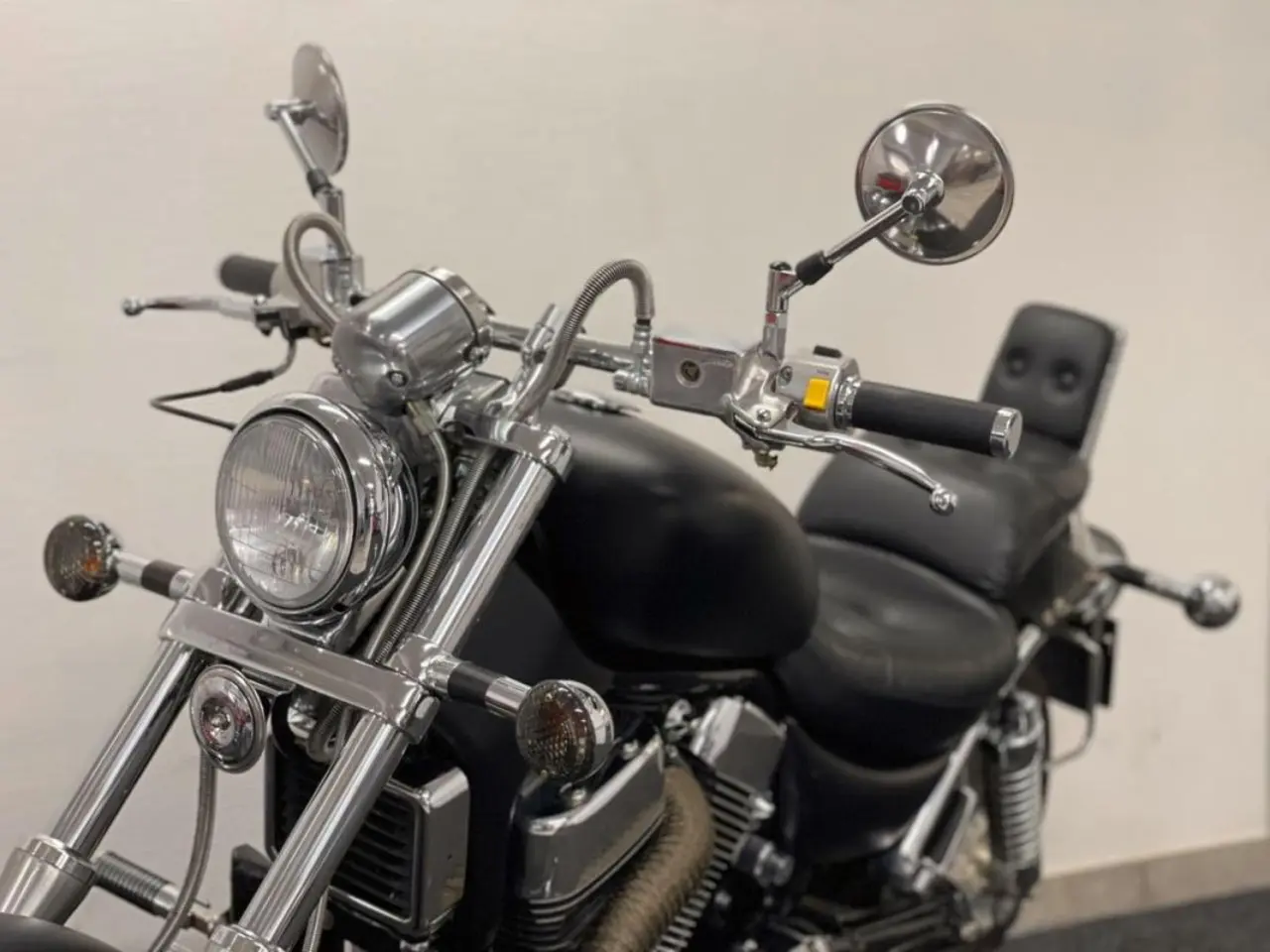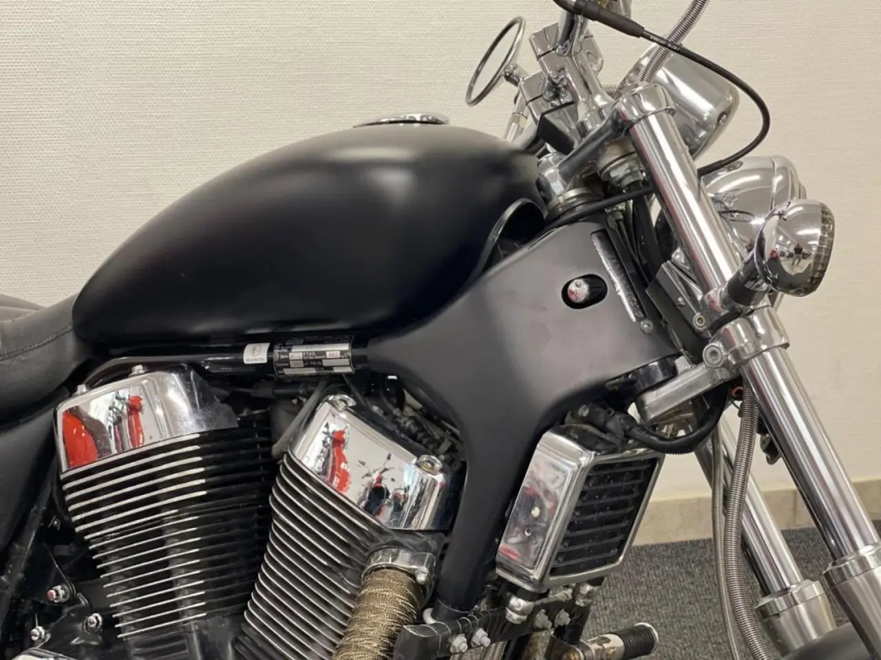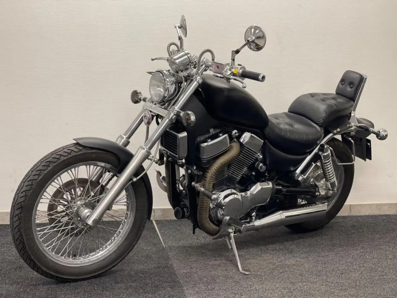 Denna är omlackad i en mattsvart kulör, rakt styre, tonade blinkersglas , lindade grenrör m.m.