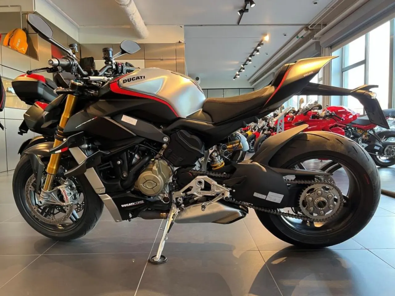 Steetfighter SP är numrerad och levereras i läcker färgsättning med mycket kolfiberdetaljer och en tank i borstat aluminium. 208 hk, 123 Nm och en torrvikt på 177kg. Brembo Stylema R bromsok med 330mm skivor. Kolfiberfälgar. Torrkoppling. Fullt justerbar aktiv elektronisk fjädring från Öhlins. Justerbara race-fotpinnar från Rizoma.