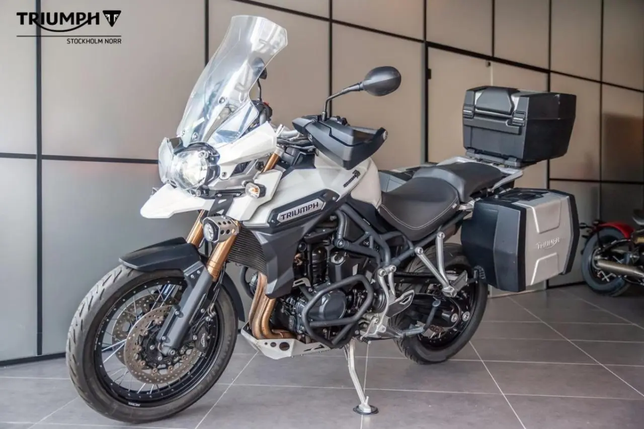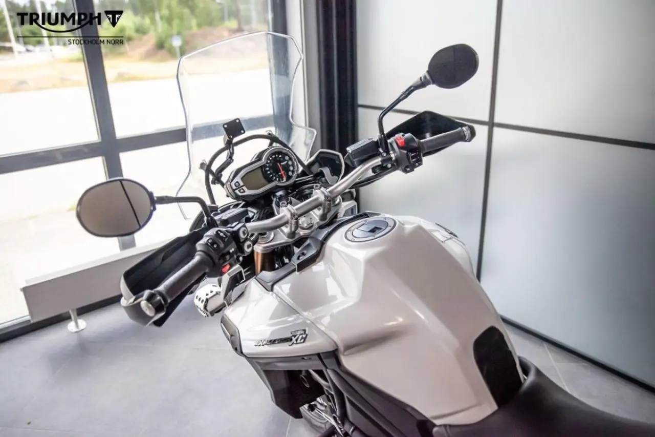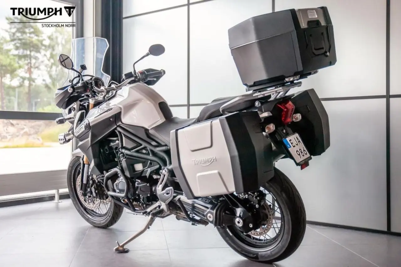 Tiger Explorer XC utrustad med bland annat tre väskor, innerväskor till sidoväskorna, motorbågar och hasplåt. Levereras nyservad.
