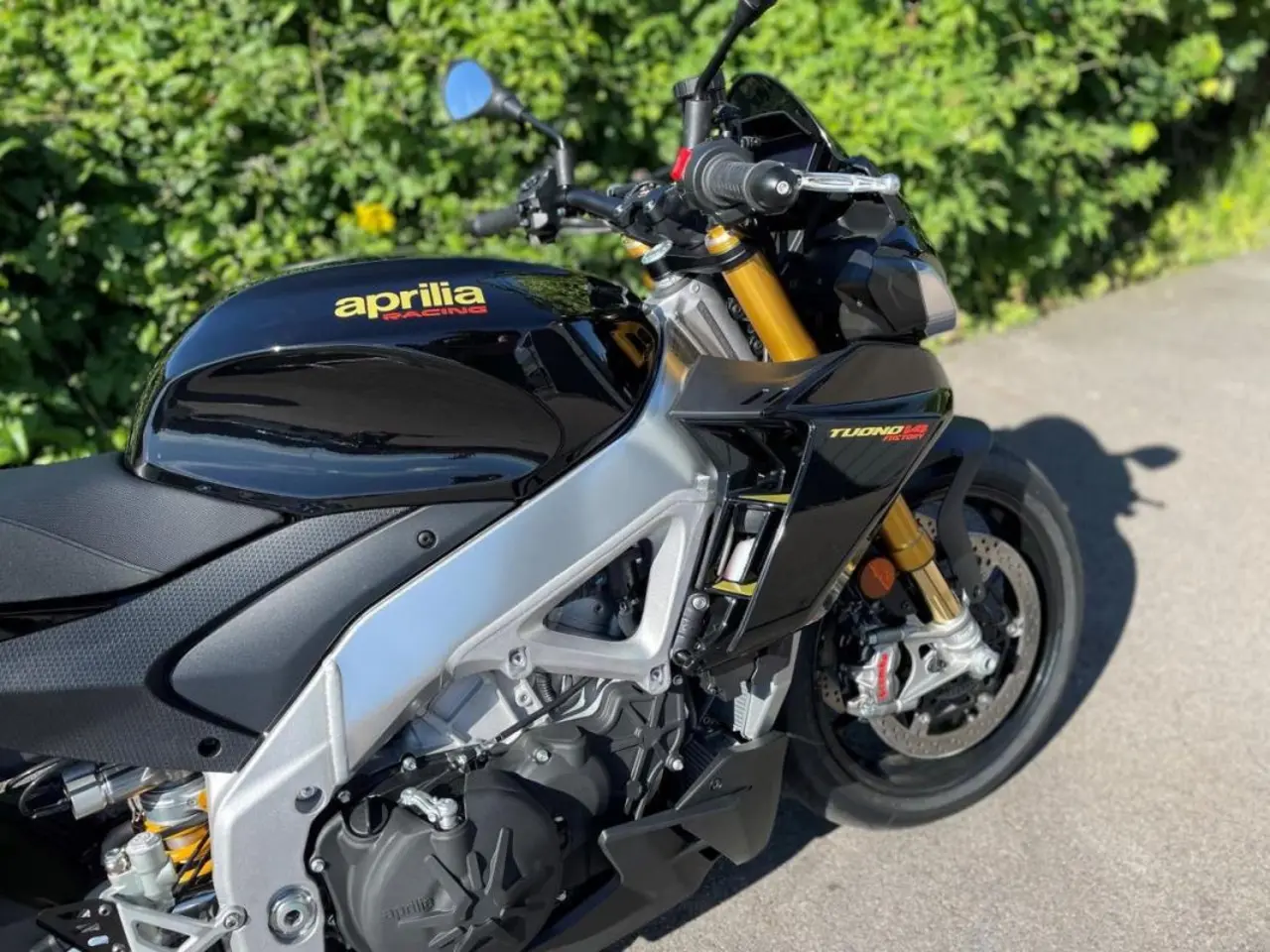 Aprilia Tuono V4 1100 Factory kommer som standard med det mest avancerade semi-activa elektroniskt styrda fjädringen på marknaden från Öhlins, Systemet har både semi-active mode och manual mode, dvs ett automatiskt läge som justeras efter hur du kör och ett manuellt läge där du kan ställa parametrarna själv.