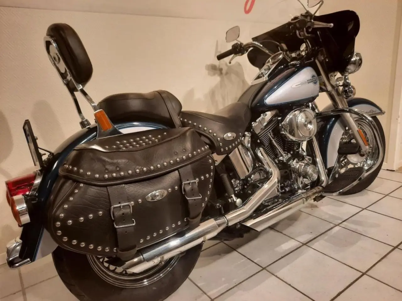 en Harley utrustad med luft & buller, Batwing + högre ruta till Batwingen, original ruta och avgassystem medföljer
