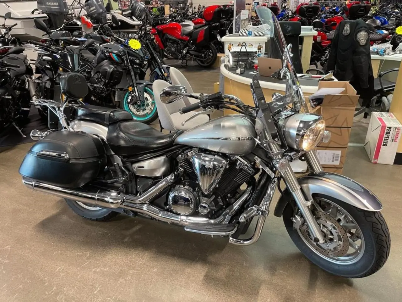 En mycket fin Yamaha XVS1300 Midnight Star Stratoliner med fina original väskor, sissy och storvindruta. Motorbågar och highway pegs. 12v-uttag. Pakethållare. Bra däck. Servad med stämplad servicebok under alla år (senaste är 2020). De sista två åren har hojen knappt använts. Endast två ägare. Ring för mer info 021-124820 XVS dragstar 1300 1900 1100