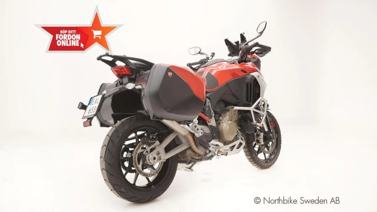 Ducati Multistrada V4S FULL. Denna populära "multi-hoj" är utrustad med: Dödavinkelvarnare, sidoväskor, Full map GPS via DucatI Connect, värmehandtag, värmesadlar, adaptiv farthållare med så mycket mera! En hoj som tack vare sina otroligt långa intervaller på ventiljusteringar (6000mil) passar utmärkt för långturerna samtidigt som den pigga V4 motorn på 170 hk och 125 Nm gör att den utmatar sporthojarna!