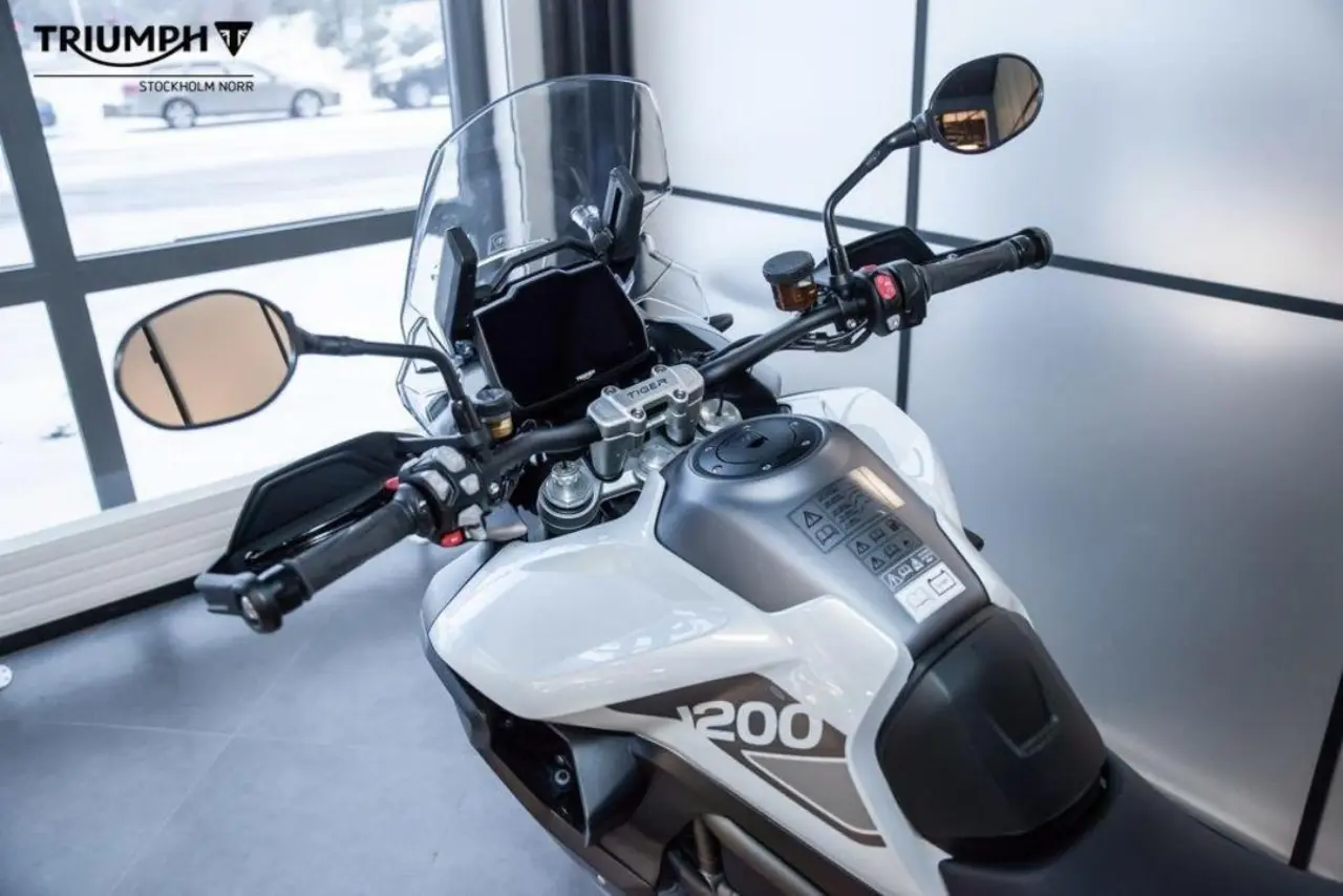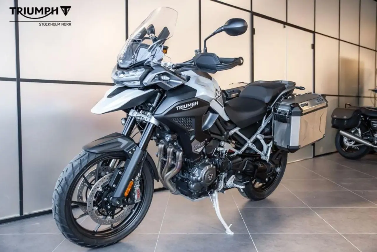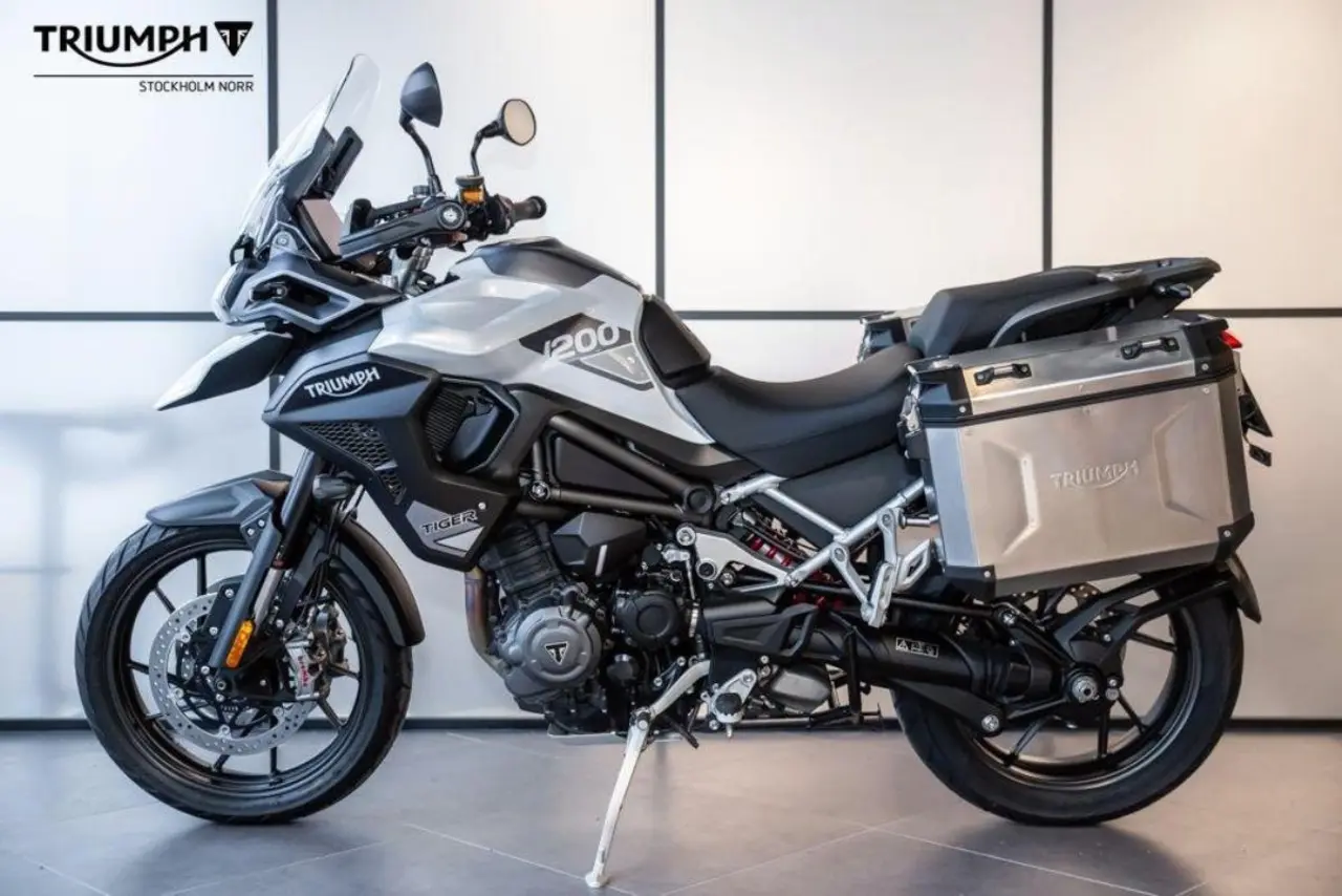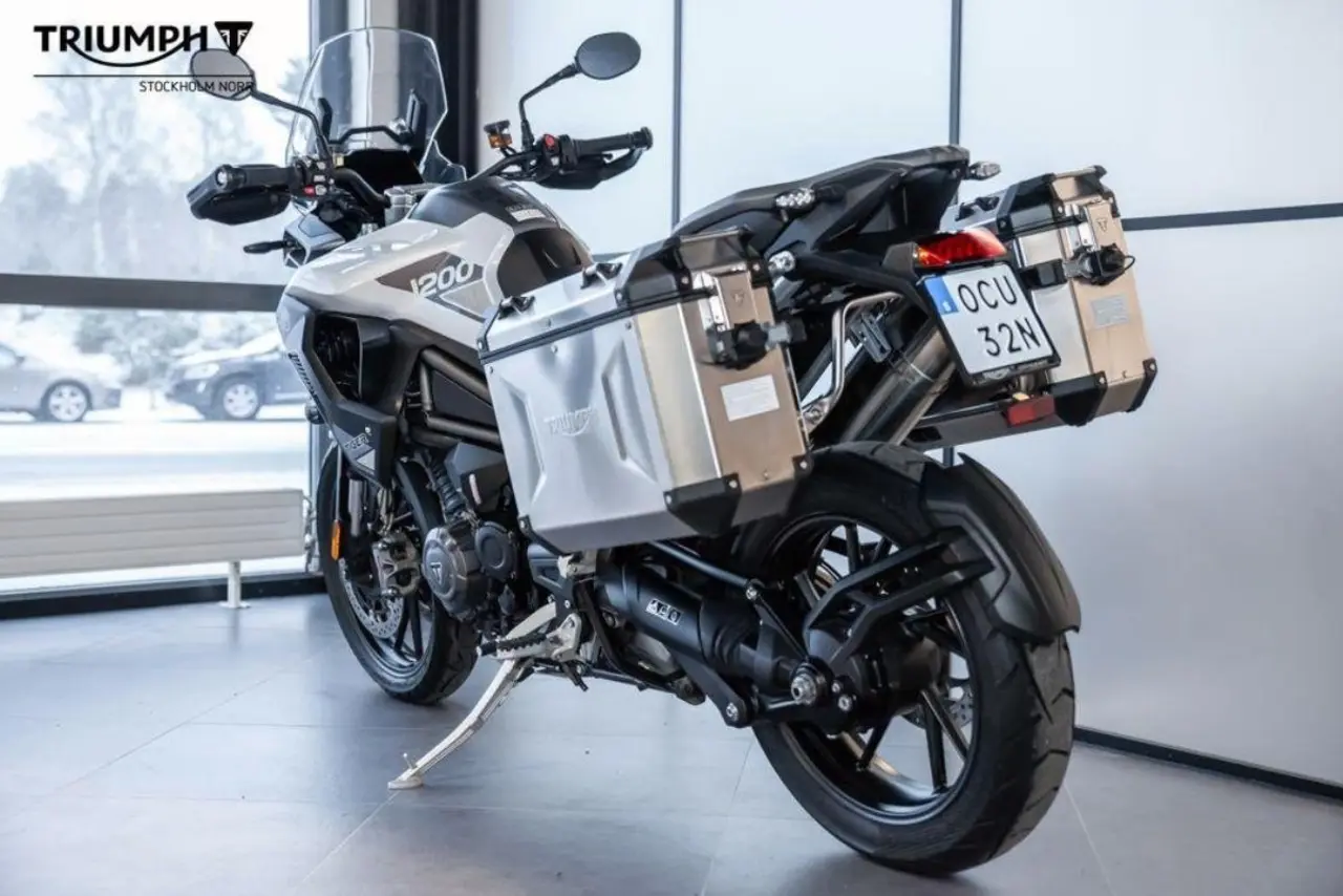 Mycket fin Tiger 1200 GT Pro extrautrustad med 2 aluminiumfärgade sidoväskor och däcktryckskontroll.