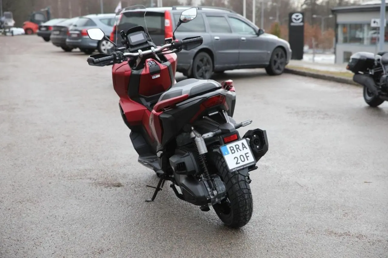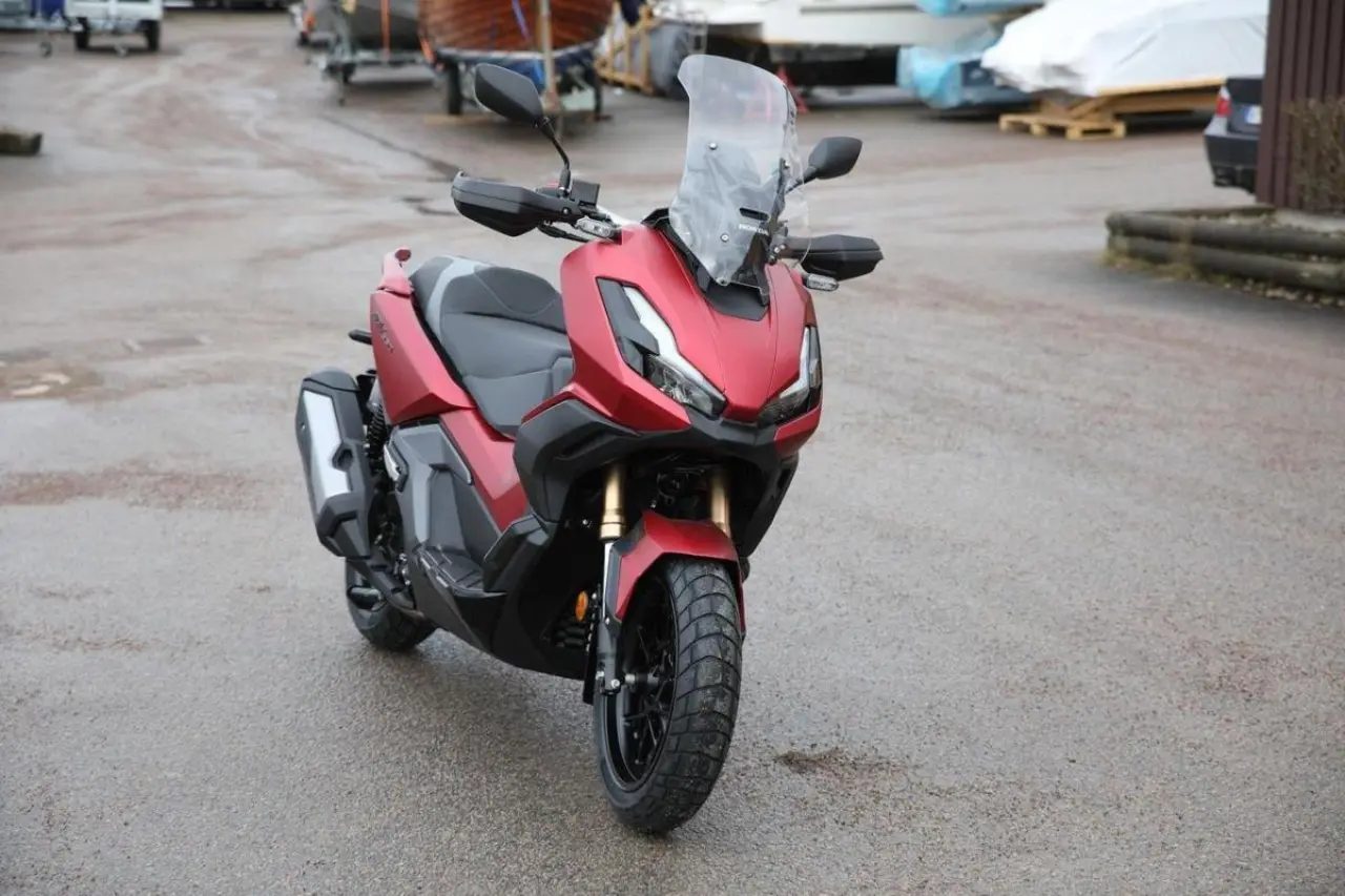 ADV350 är en ny modell för året som ärvt den tuffa äventyrsstilen från storebror X-ADV och bygger på ett robust chassi med stålrörsram med 37 mm inverterad framgaffel och dubbla gasstötdämpare baktill. 330-kubikaren levererar pigga 21, 5 kW och antispinn ser till att bakdäcket behåller greppet under hård accelereration. Kåpglasets höjd är justerbar, det finns plats för två integralhjälmar under sadeln och i handskfacket sitter ett USB C-uttag. Den digitala instrumentskärmen... är utrustad med röststyrning för smarttelefon och smartnyckeln gör skotervardagen enklare och bekvämare.