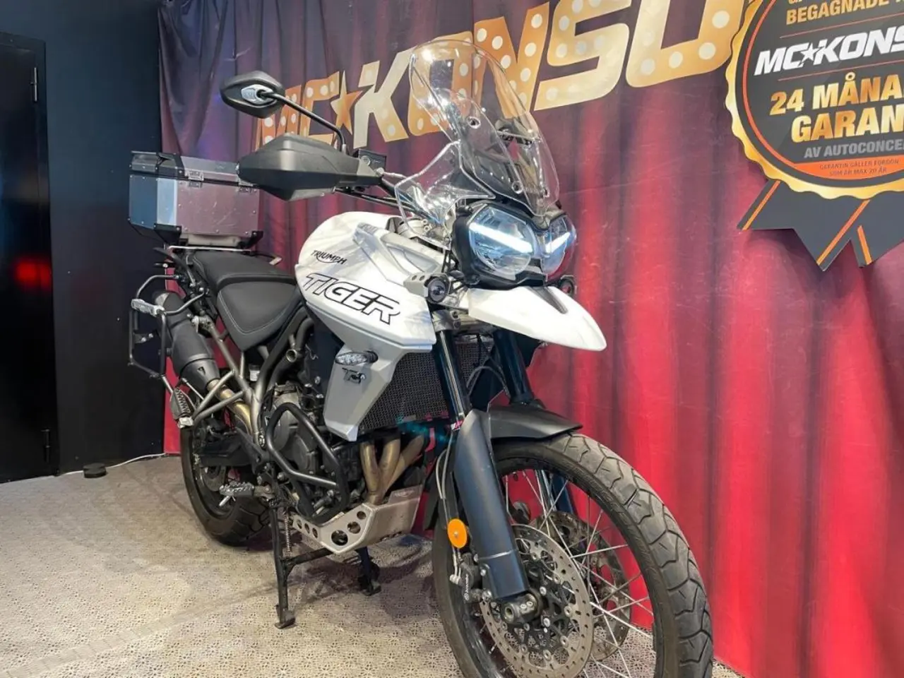 Favoriten bland äventyrshojar! Tiger 800 XCA med original sidoväskor och top-box i aluminium. 21x17 ekerhjul. ABS. Farthållare, Värmehandtag. Värmedyna. USB. 12V uttag. Sex olika Riding Modes. Med mera.