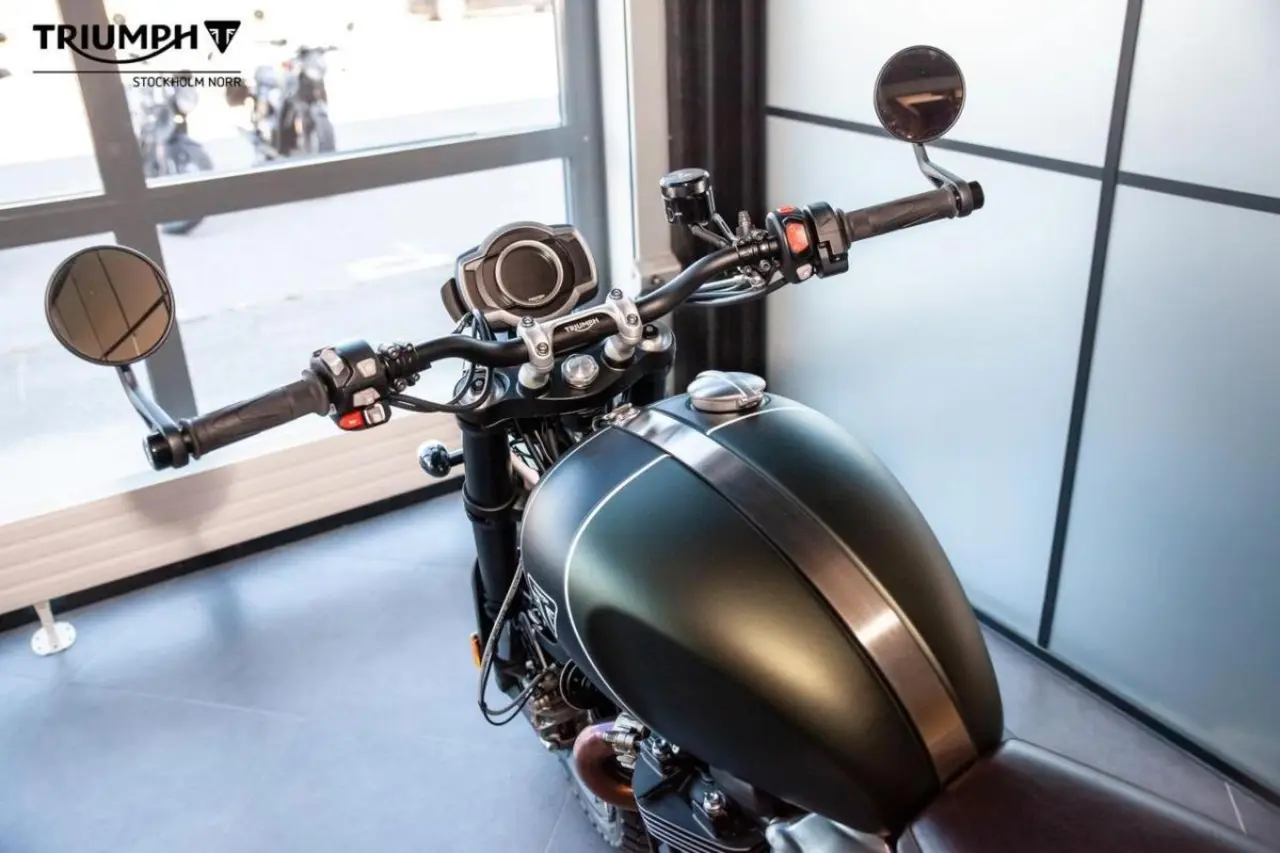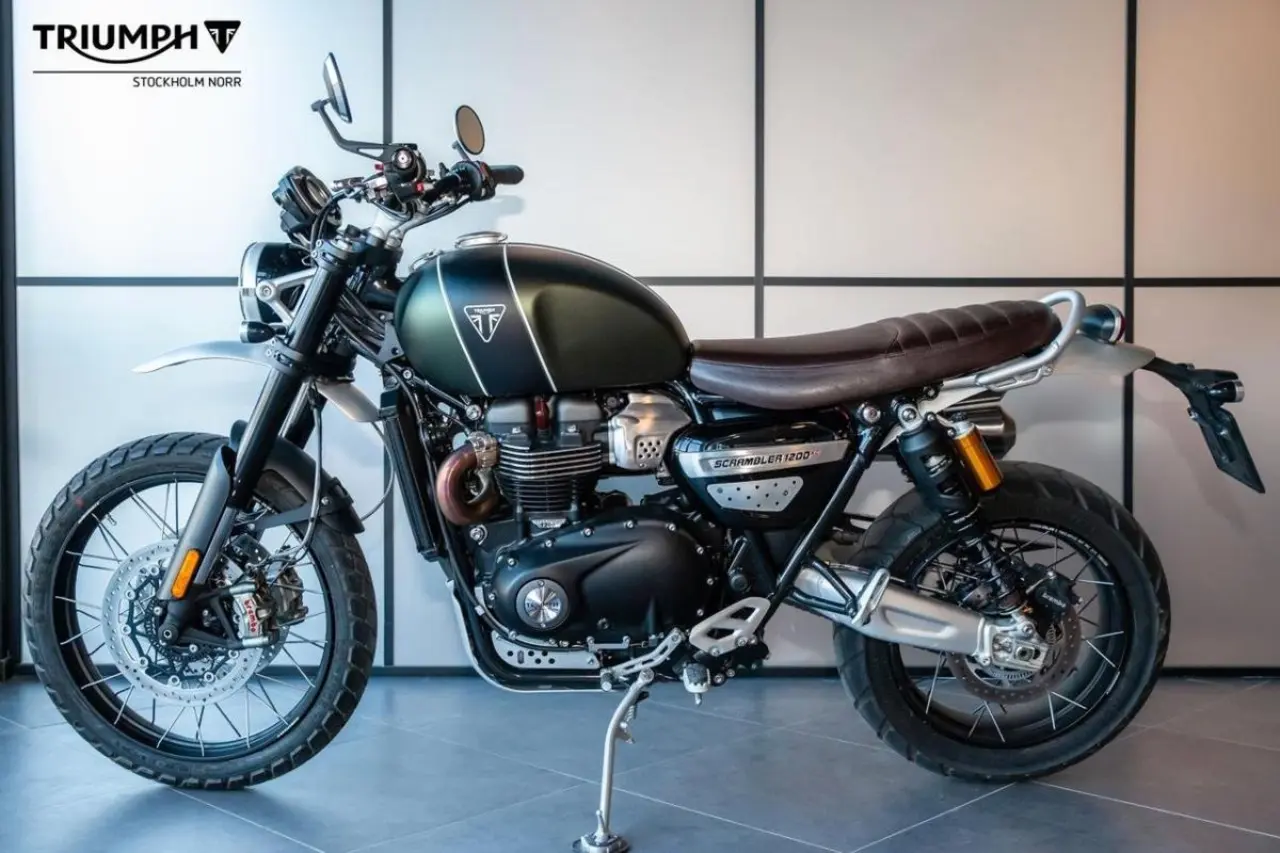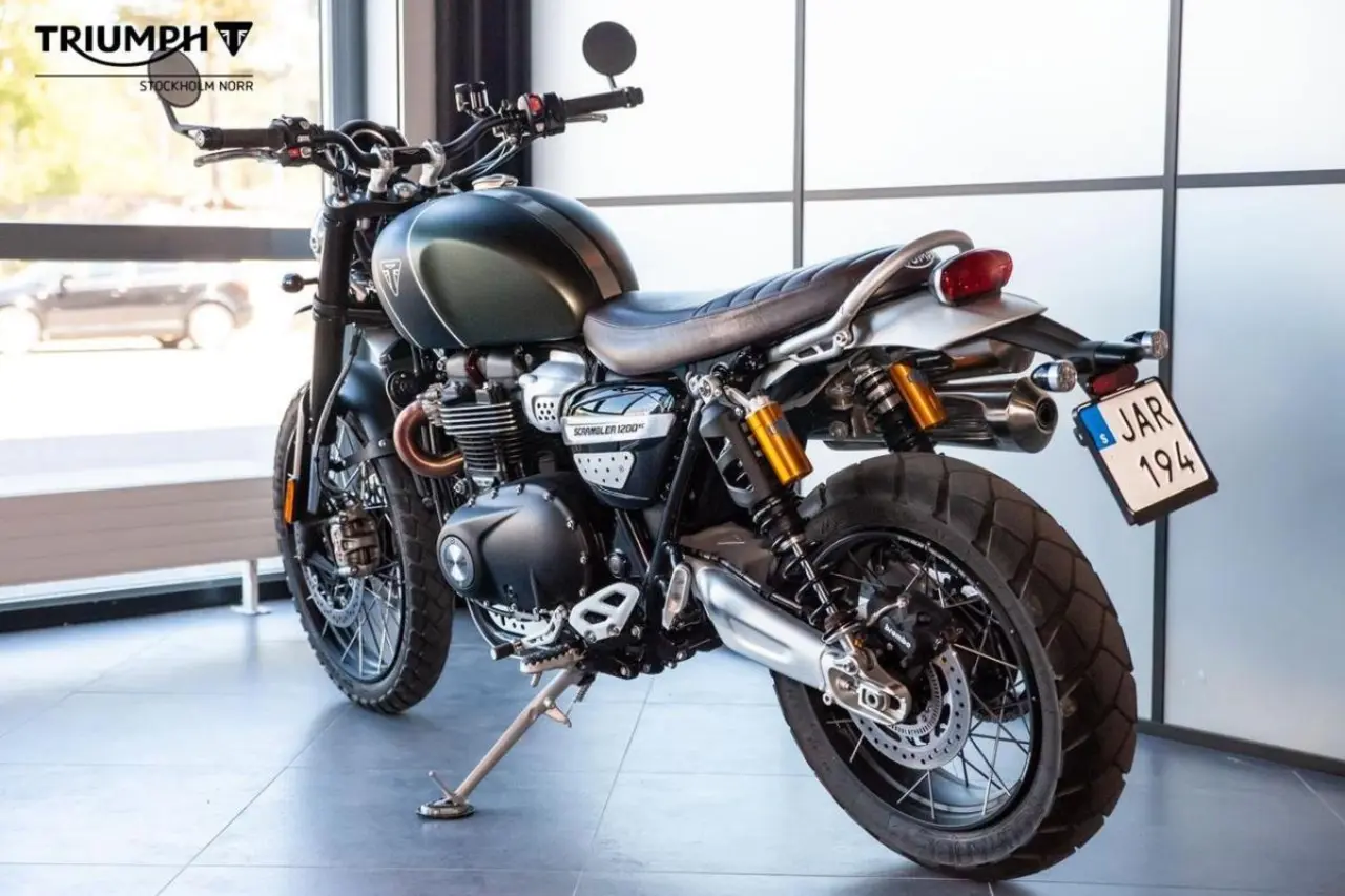 Triumph Scrambler 1200 XC extrautrustad med bland annat bar end mirrors, högre stänkskärm fram, miniblinkers fram & bak, lyktgaller och bromsvätskebehållare från Triumph.
