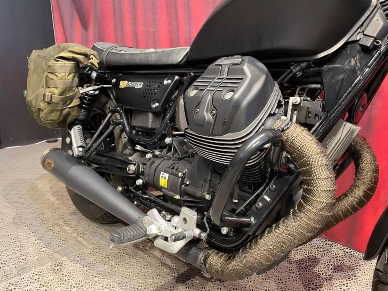 Moto Guzzi V9 Bobber i ett påkostat utförande. Här sitter det ett italiensk avgassystem från ZARD monterat för rätt ljud och utseende, certifikat för godkänd användning på väg. GIVI crashbars/motorbågar och lindade avgaskrökar är helt rätt på denna hoj. BAAK backspeglar är snyggt. BUSHCRAFT mjuka sidoväskor sitter med låsbart fäste från Hepco-Becker, bärremmar finns också, snygga och unika i sitt slag. 1:a service är gjord och mätaren visar låga 250 mil. En ägare som tog ut den i trafik 2022-05-05