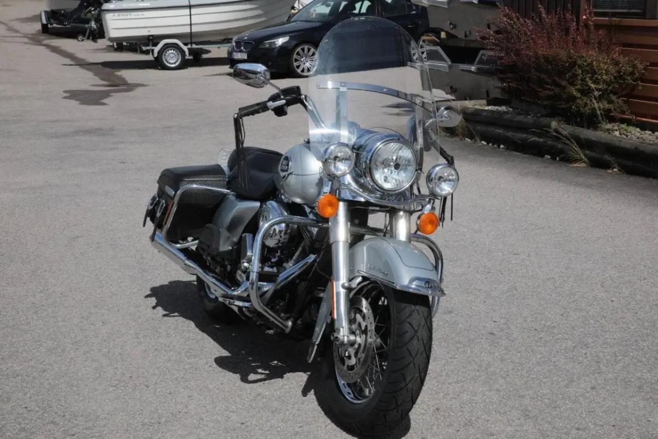 Här är en Road King av 2010 års modell, uttagen 2014 som fortfarande känns som ny än idag och är utrustad med motorbåge, luft o buller. Original avgas medföljer. Säljes nyservad och nybesiktigad (till 2025-06-30) med nya däck fram och bak. Kundförsäljning.
