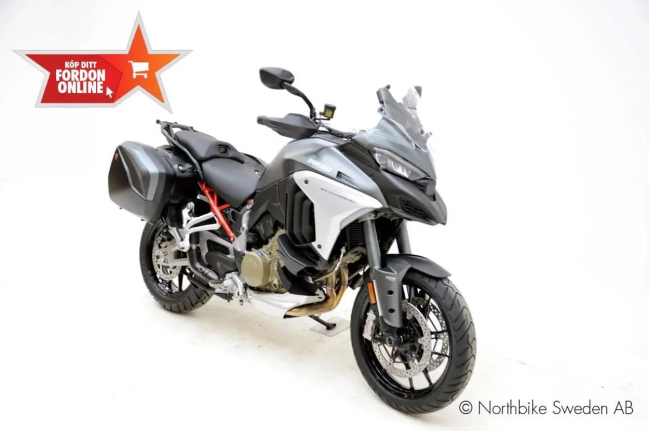 Ducati Multistrada V4S Travel & Radar. Denna populära "multi-hoj" är utrustad med: Dödavinkelvarnare, sidoväskor, Full map GPS via DucatI Connect, värmehandtag, värmesadlar, adaptiv farthållare med så mycket mera! En hoj som tack vare sina otroligt långa intervaller på ventiljusteringar (6000mil) passar utmärkt för långturerna samtidigt som den pigga V4 motorn på 170 hk och 125 Nm gör att den utmatar sporthojarna! 4 Års garanti.