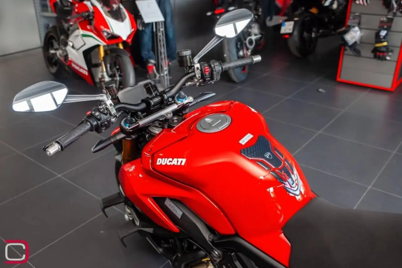 Ducati Streetfighter V4 S extrautrustad med tank pad.