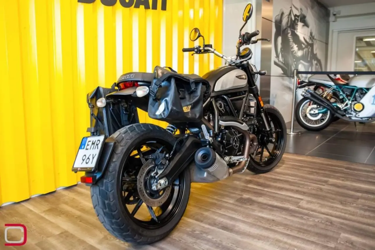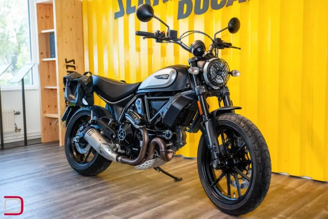 Ducati Scrambler Icon dark extrautrustad med sidoväskor, kraschpuckar från R&G racing och galler för strålkastare.