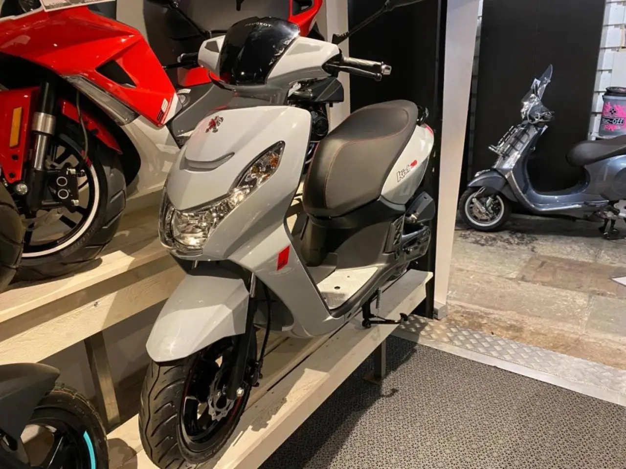 Peugeot Kisbee har mycket goda förvaringsmöjligheter, ett plant golv och med fotplattor i aluminium. Sadelhöjden är 760 mm och har en upprätt körställning som ger dig en stabil och säker körställning, med mycket god överblick av dina medtrafikanter. Denna modell har en 6.5 liters tank, 12 tums aluminiumfälgar och en analog instrumentering.