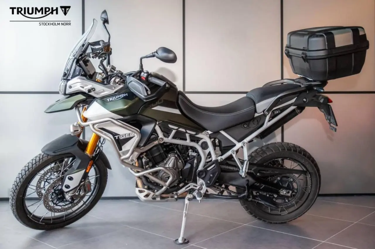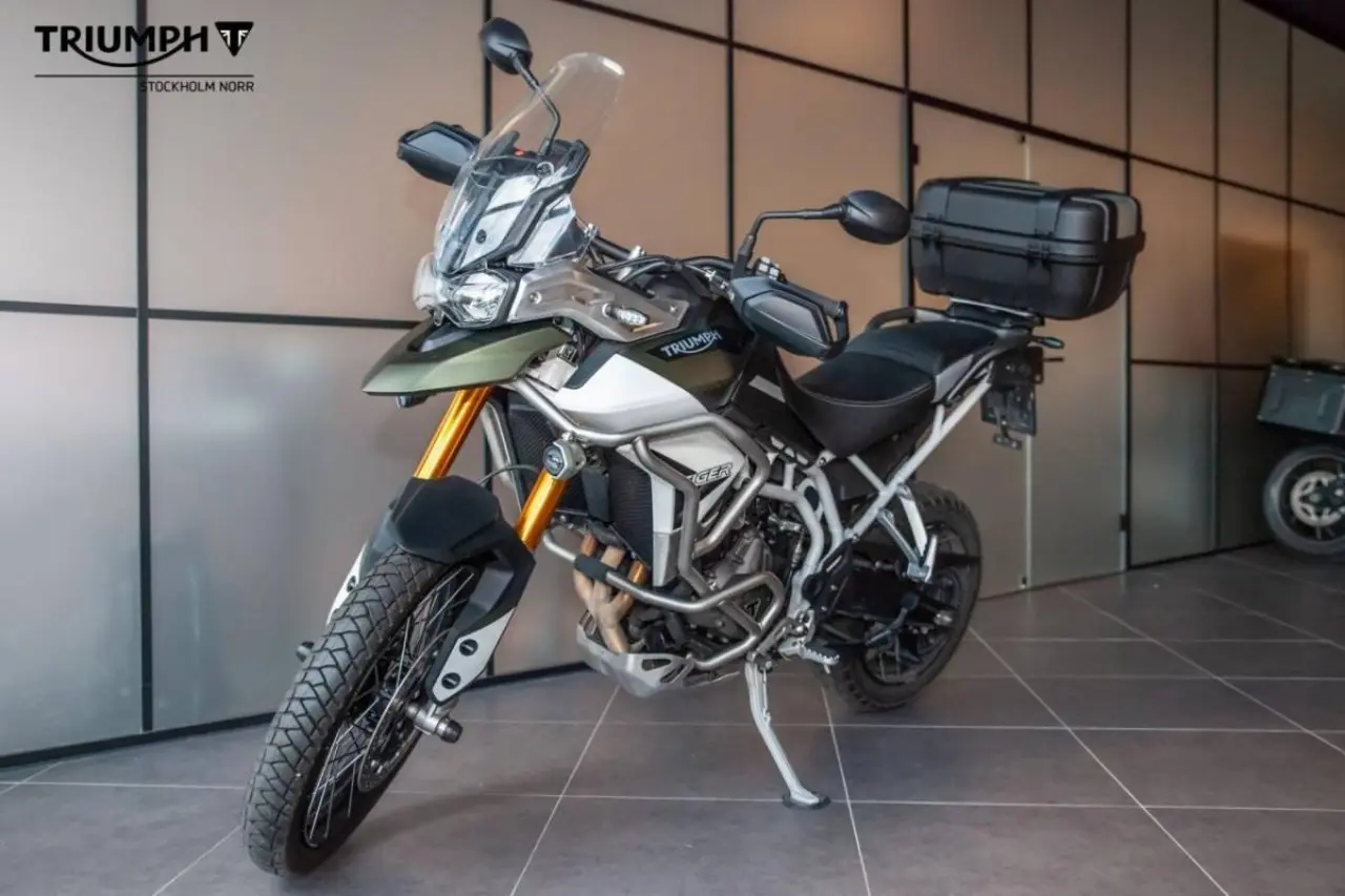 Triumph Tiger 900 Rally Pro extrautrustad med bland annat Slipon från Mivv, topbox på 52 liter, värmehandtag, tank pad, nedre och övre motorbågar, extraljus, front fork slider och centralstöd.