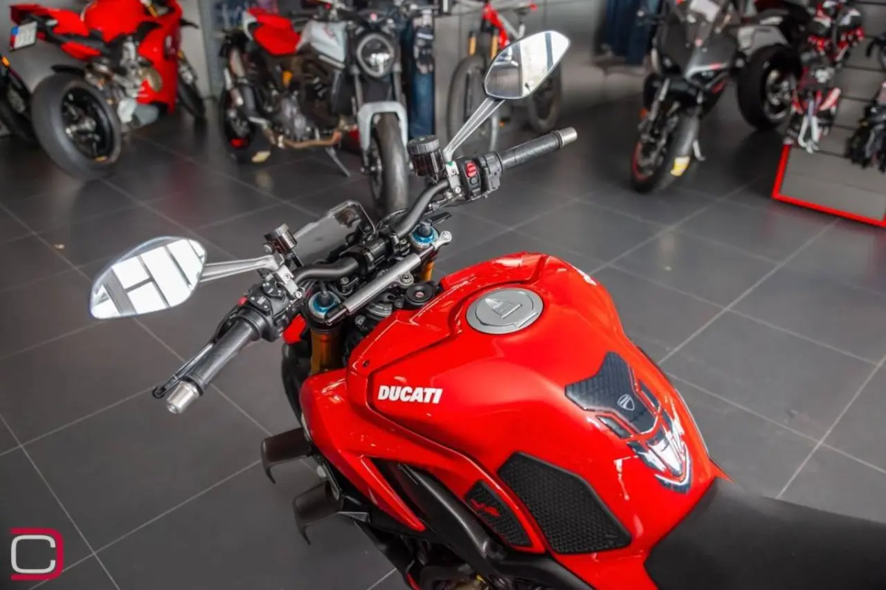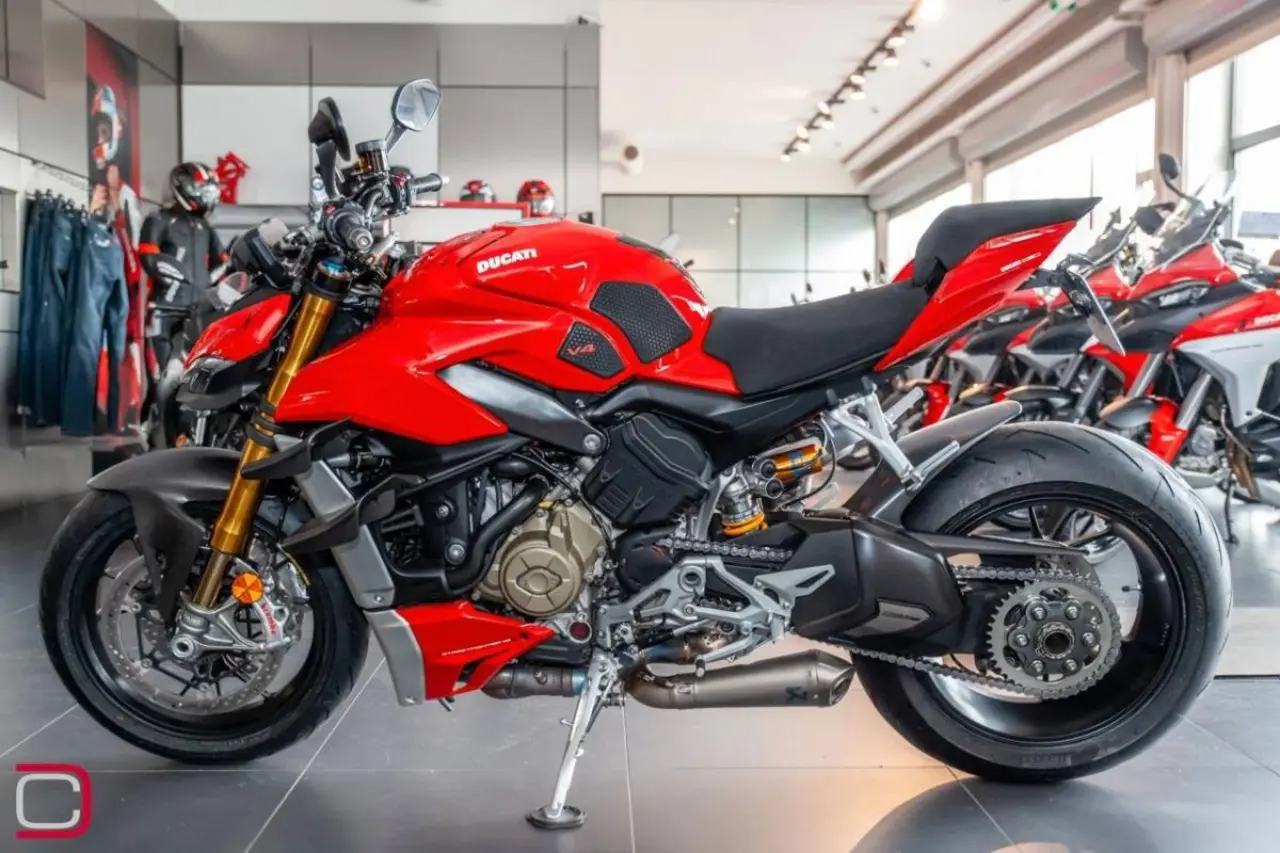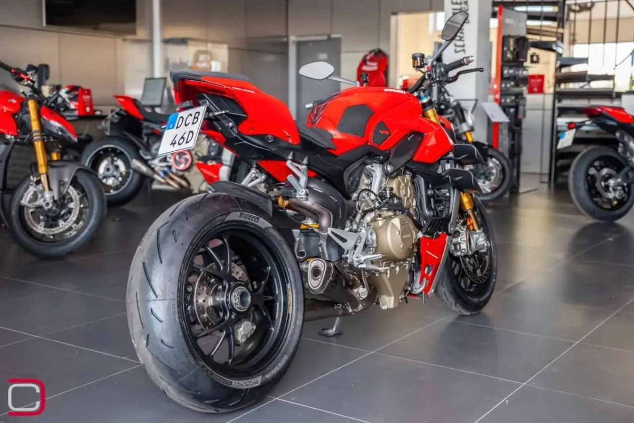 Ducati Streetfighter V4 S extrautrustad med Akrapovic slipon med tillhörande mappning, tailtidy & miniblinkers fram och bak från Rizoma, knee pads, tank pad, kylarskyddsgaller från Evo tech.
