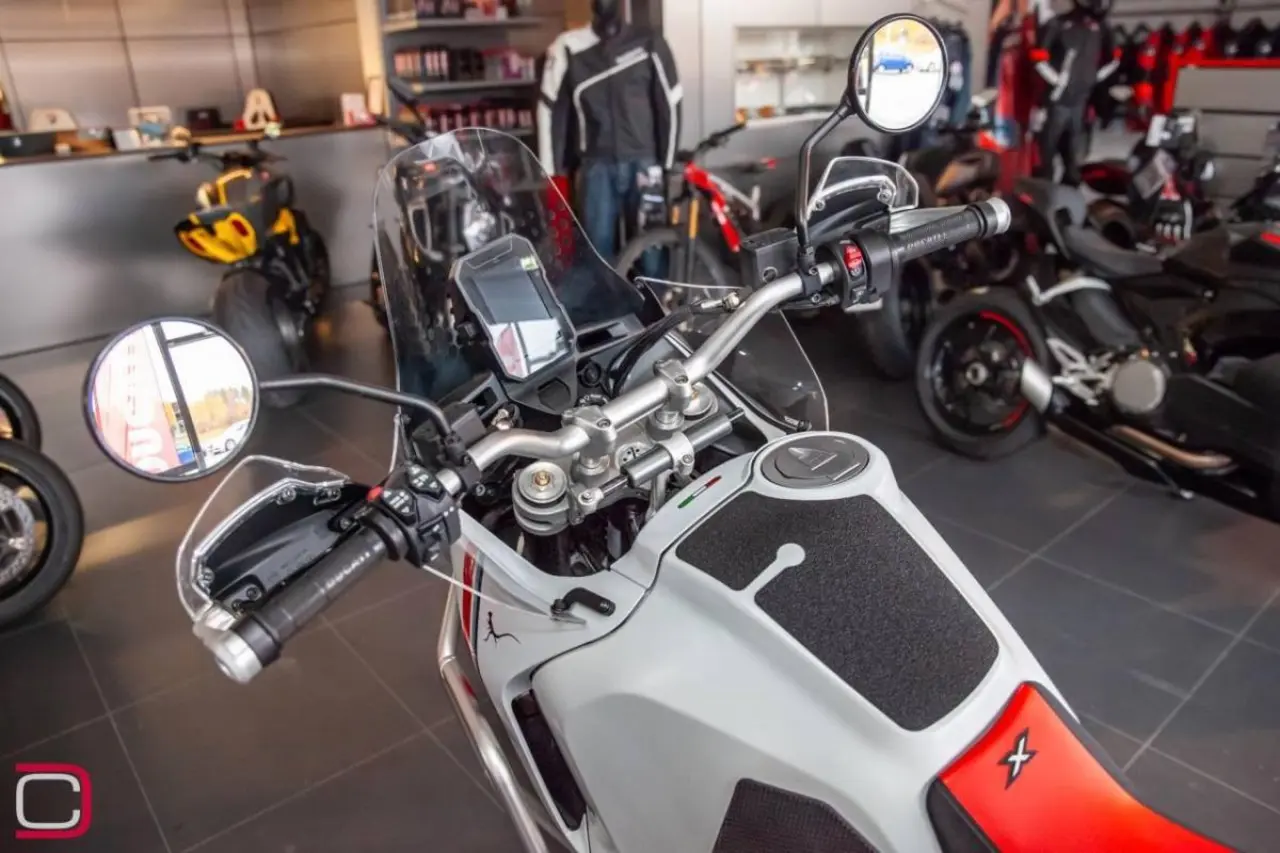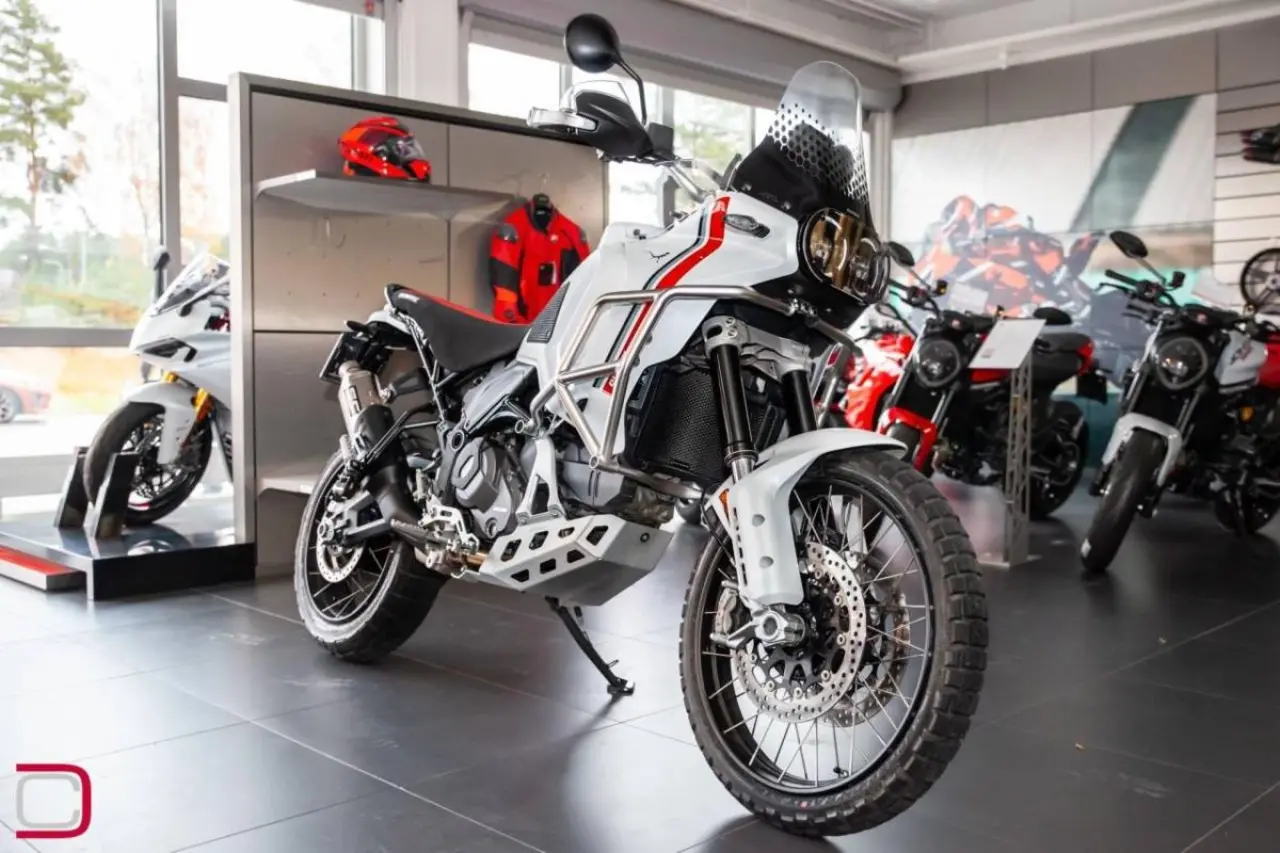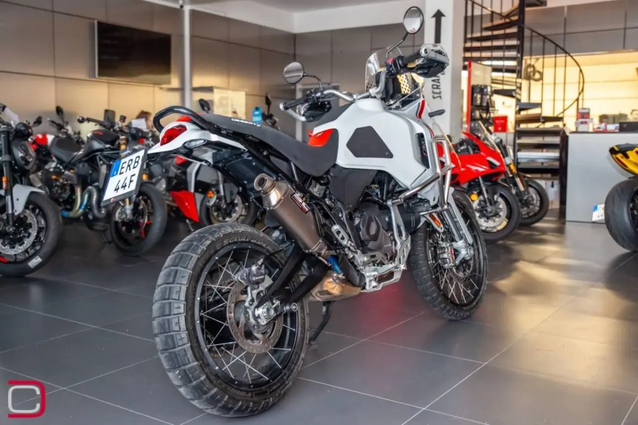 Ducati Desert X extrautrustad med bland annat slipon från SC Project, värmehandtag, motorbågar och skydd för vattenpump, kylarskyddsgaller, rejälare handguards och större hasplåt.