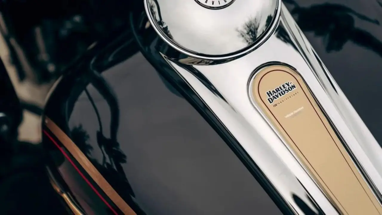 - Varje sida av bränsletanken har ett glasmotiv i art déco föreställande en flygande örn, en ikonisk Harley-Davidson-symbol.