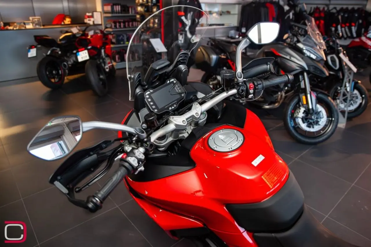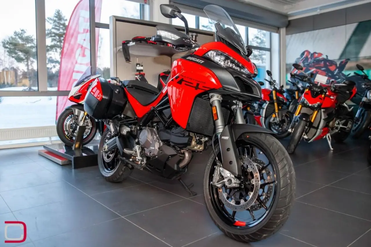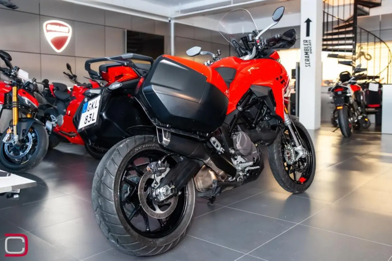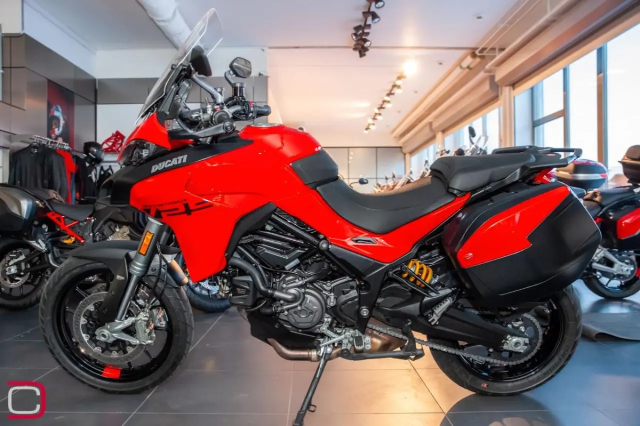 Ducati Multistrada V2 S Travel utrustad med bland annat sidoväskor, handtagsvärmare, centralstöd, farthållare och elektronisk fjädring.
