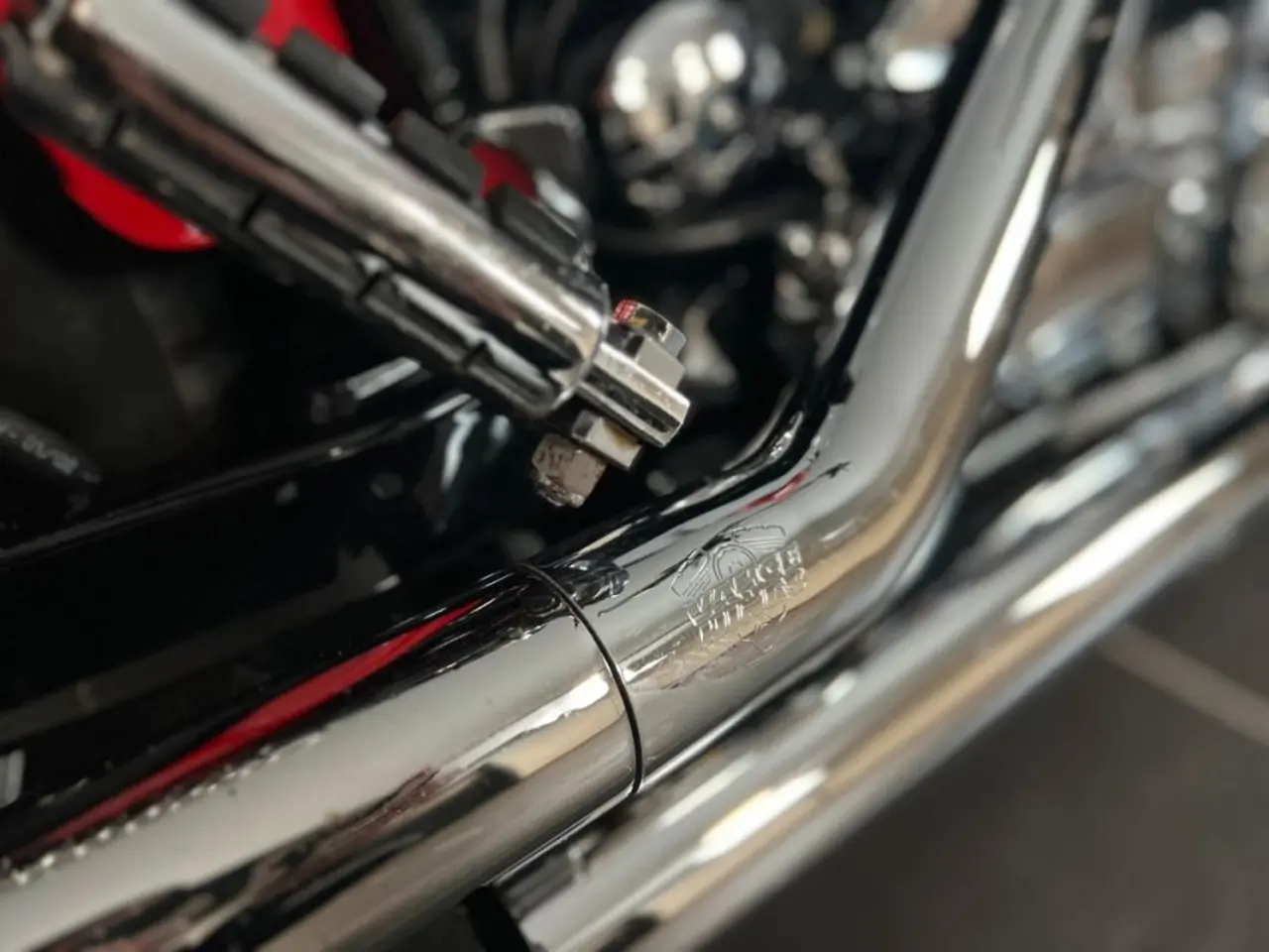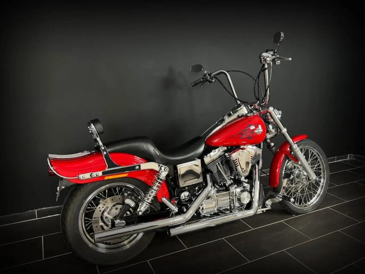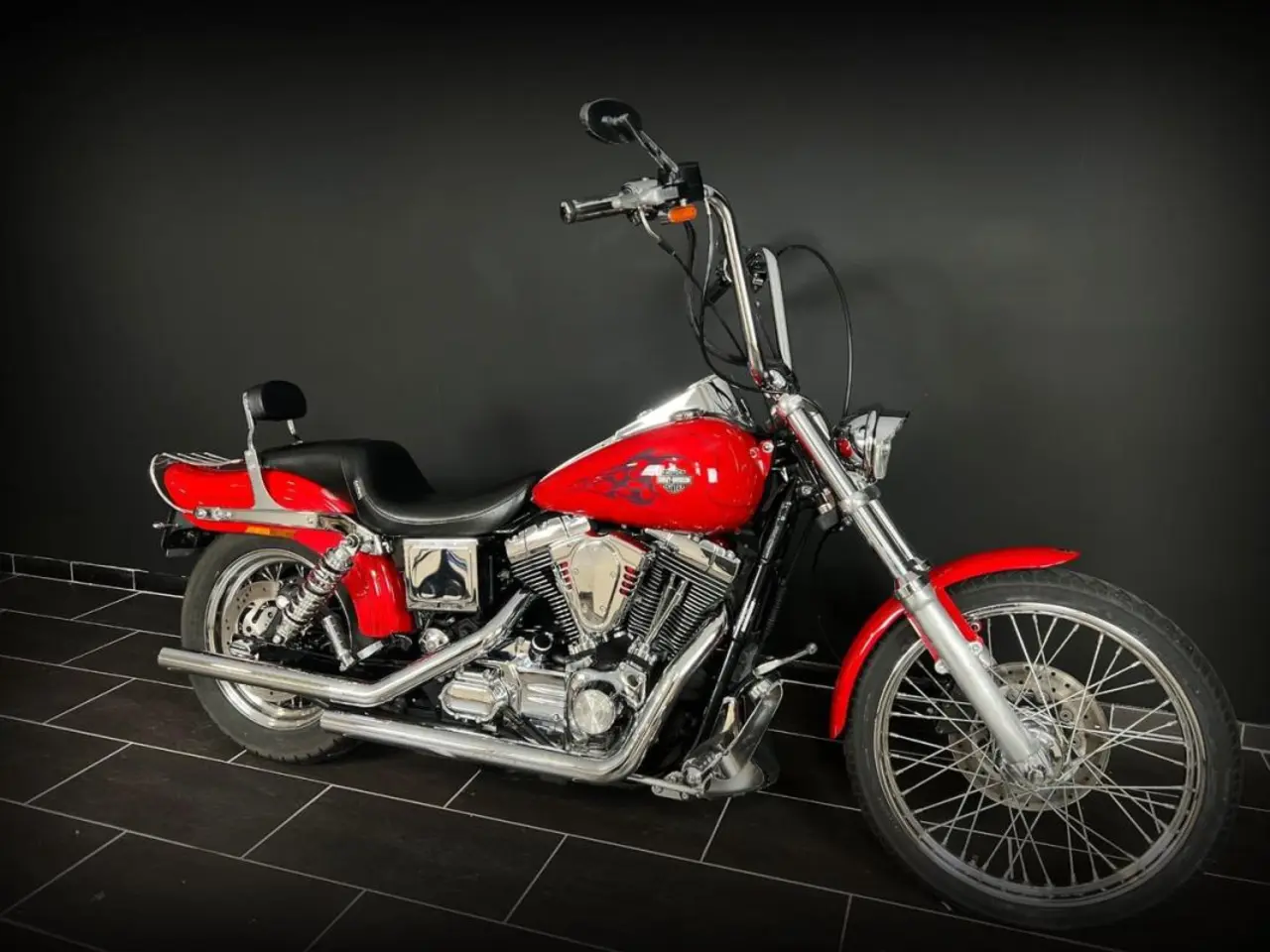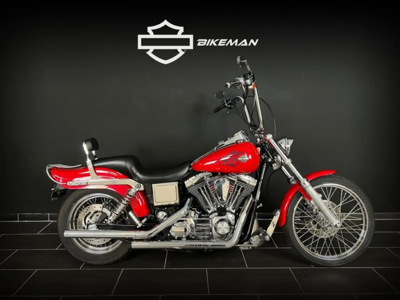 Klassiska Dyna Wideglide i sin vackra röda lackering. Extra utrustad med luft och buller från Vance&Hines för bästa ljudet och lite mer effekt. Du sitter skönt tack vare 14" styret och sadeln från Le Pera samt framflytt från Kuryakyn. Dyna wide glide är precis som Streetbob FXDB och Fatbob FXDF en riktigt fin retrobåge.