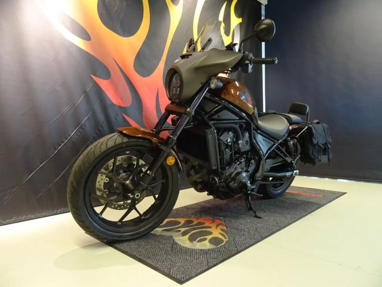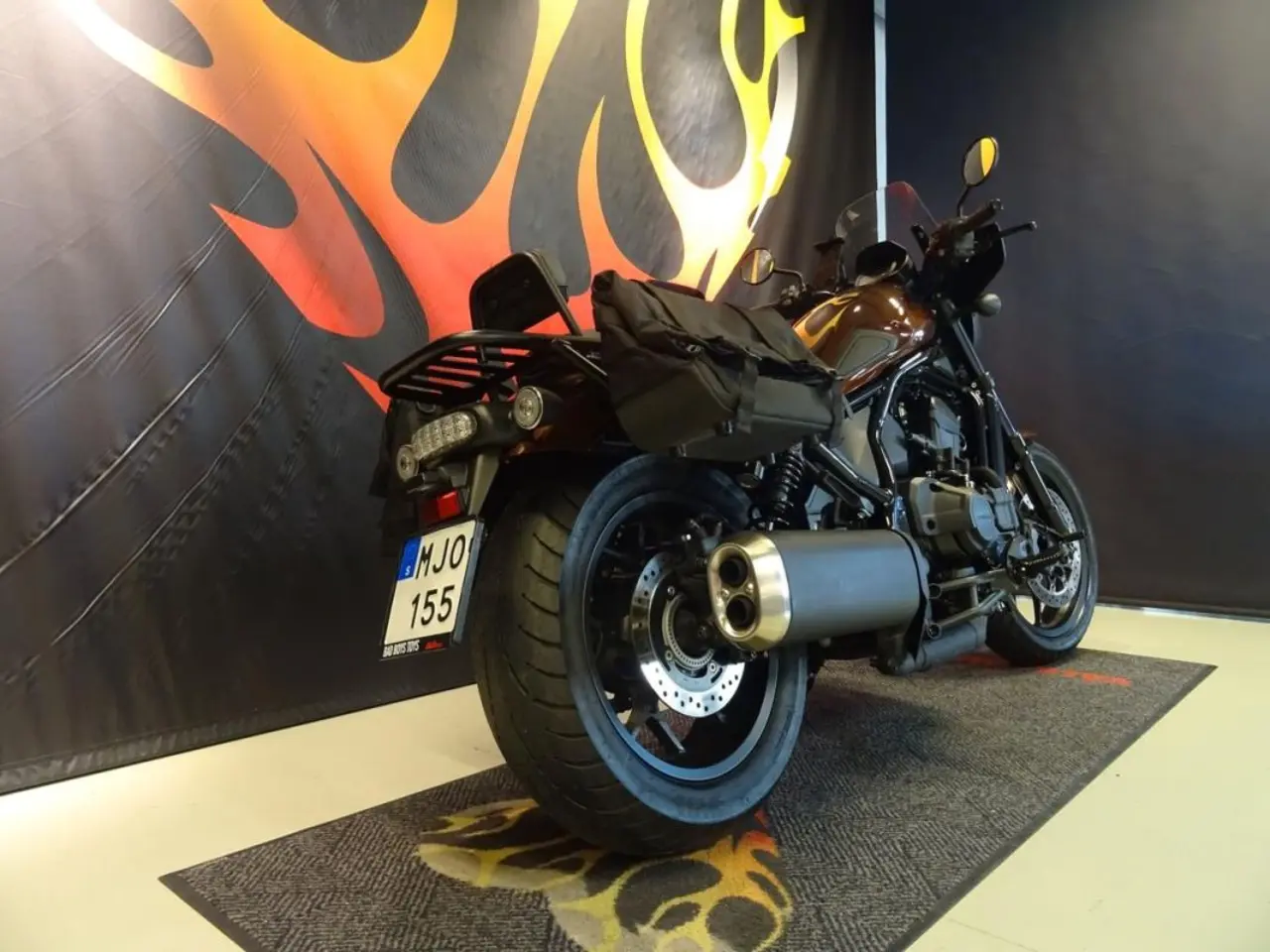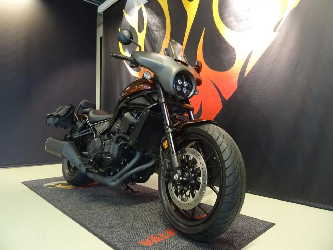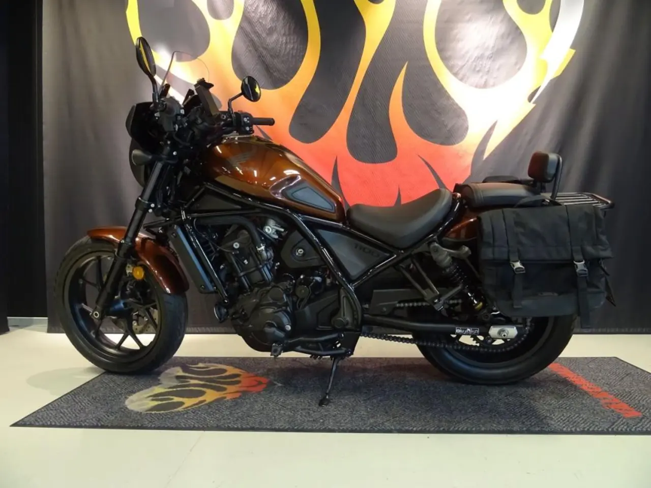 Hondas fina Rebel 1100 med automat, en bra och välskött hoj med låga mil som fungerar bra både på den långa touring turen och att pendla till jobbet. Extra utrustad med mjuka väskor, sissy med pakethållare samt batwing kåpa med högre ruta.