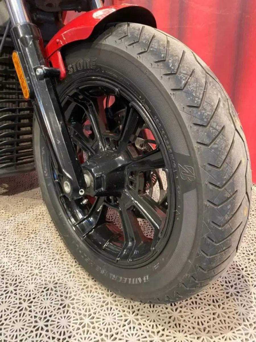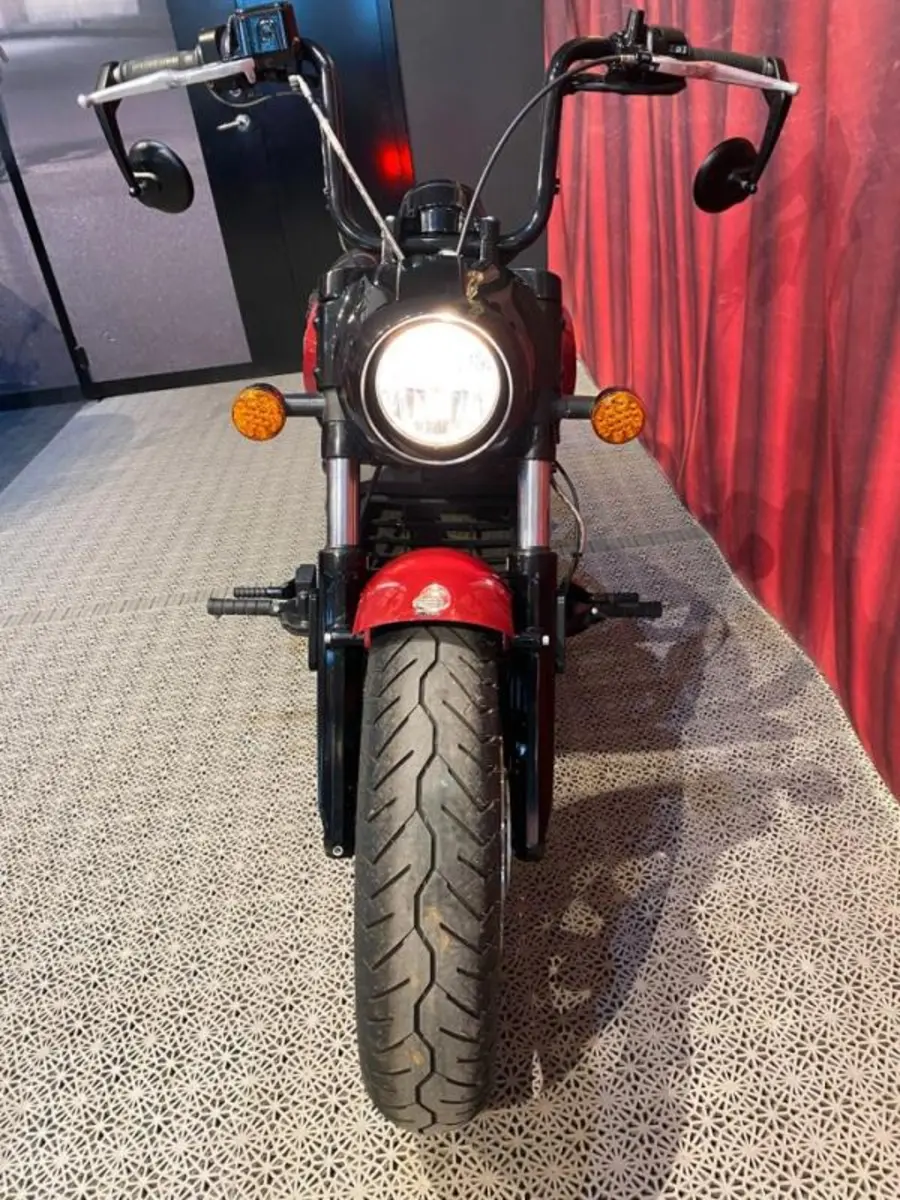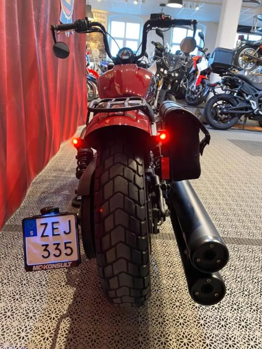 Fin Scout Bobber med sidoväska, pakethållare, sidomonterad skylt, värmehandtag, miniblinkers bak. 1800 mil på mätaren.