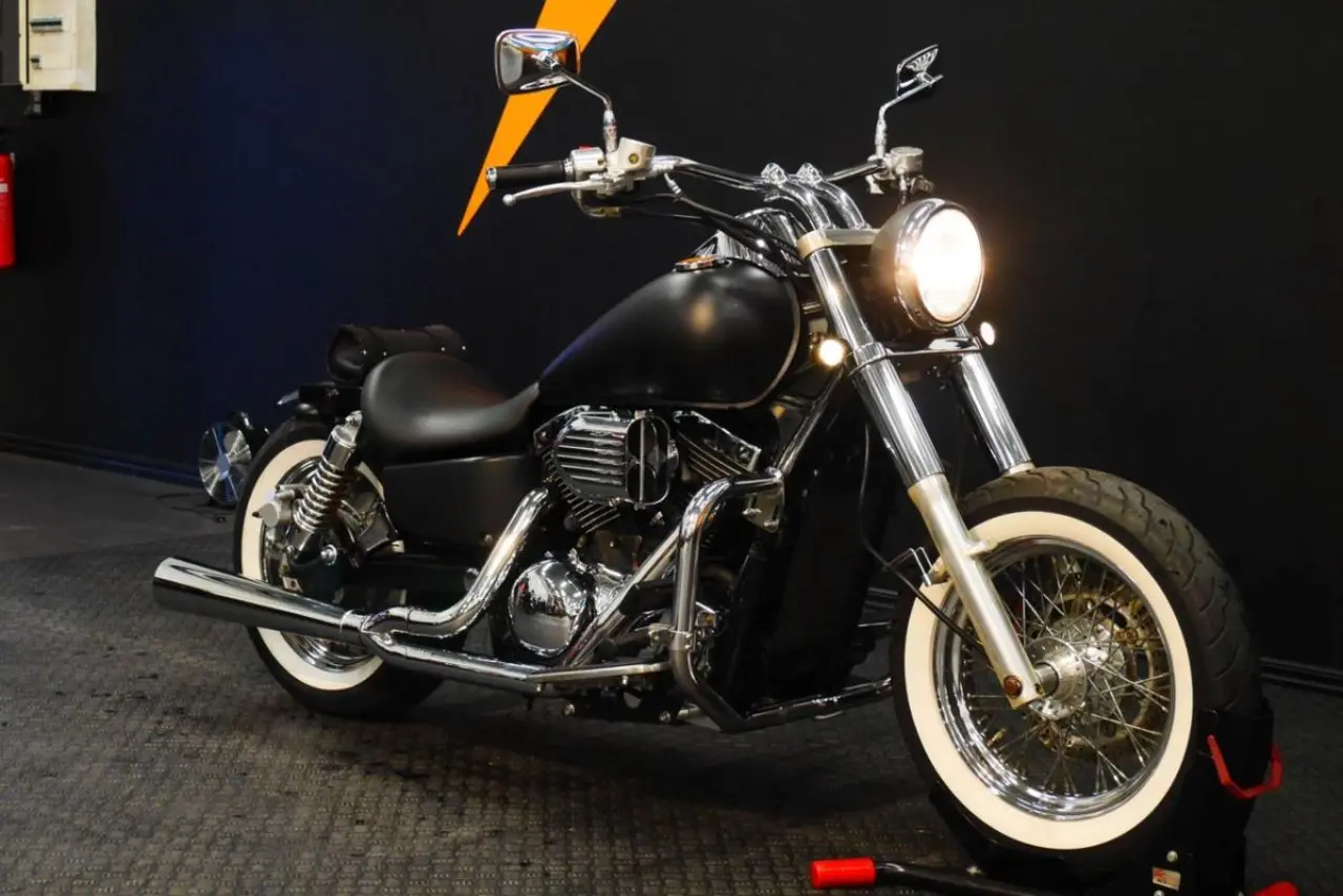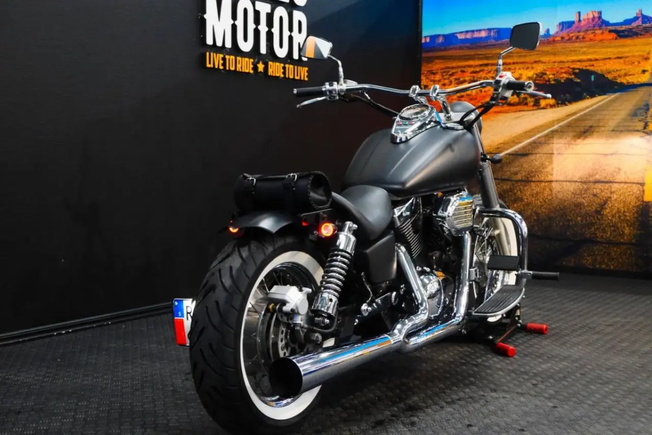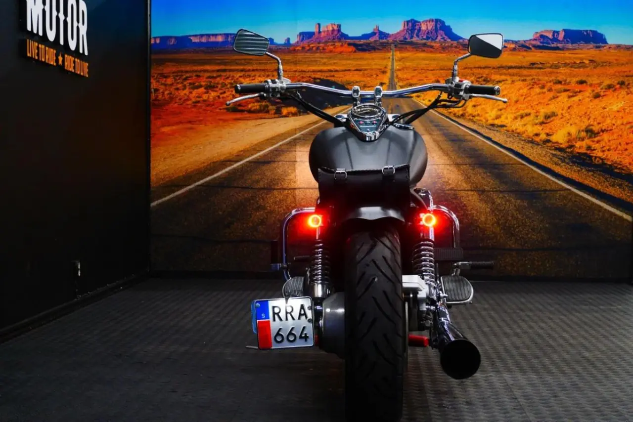 Mycket fin ombyggd Kawasaki Vulcan, matt svart med Vance&Hines avgassytem.