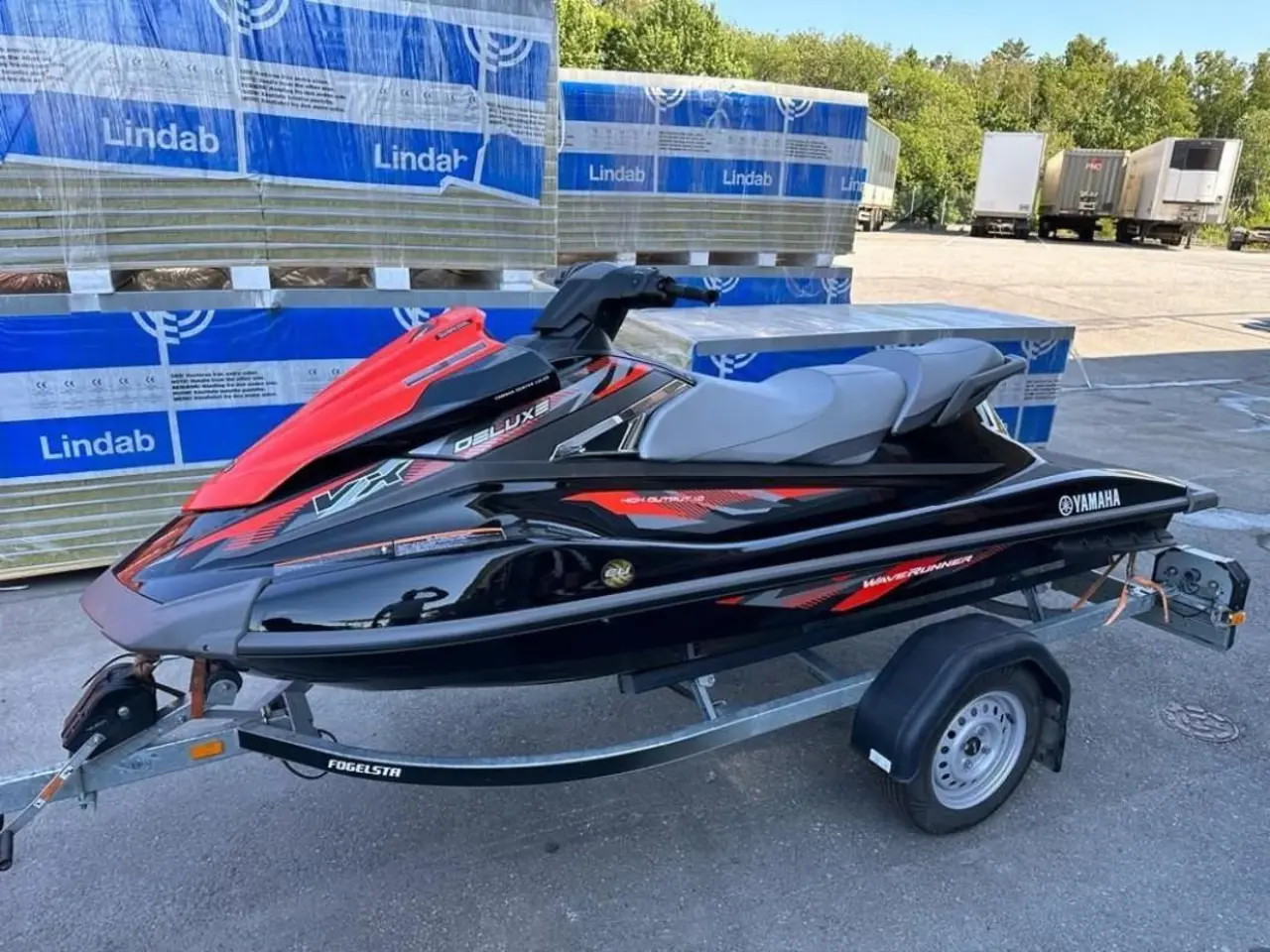 Vattenskotern har tillhörande Fogelsta bromsat 80-släp som är besiktigat t.o.m 30-06-2025, däck i fint skick.
