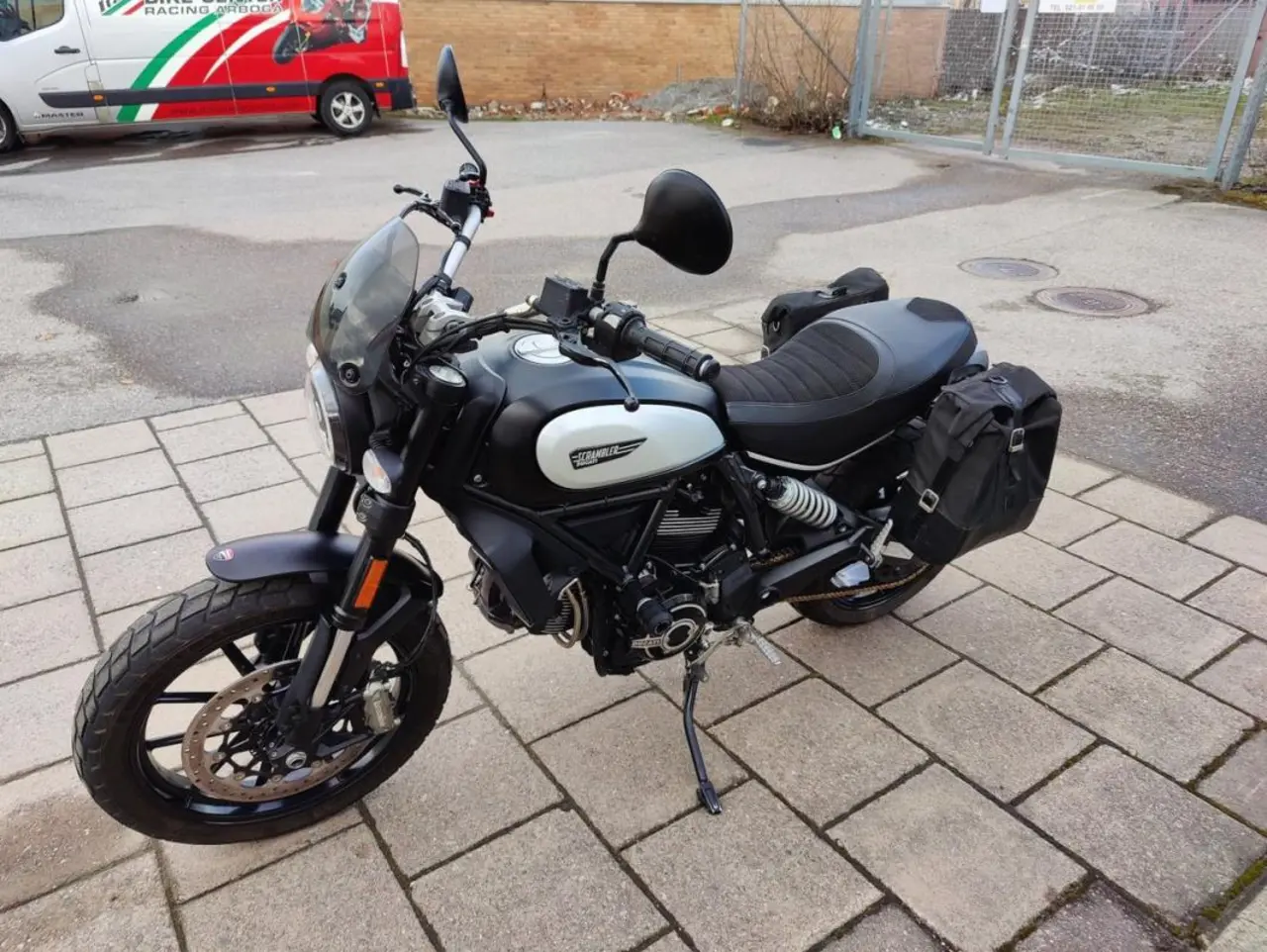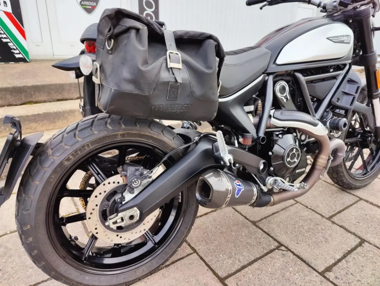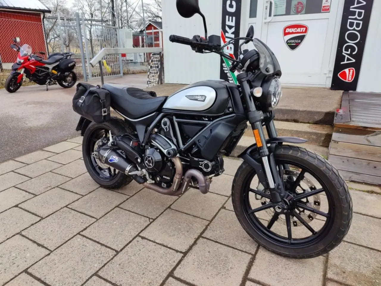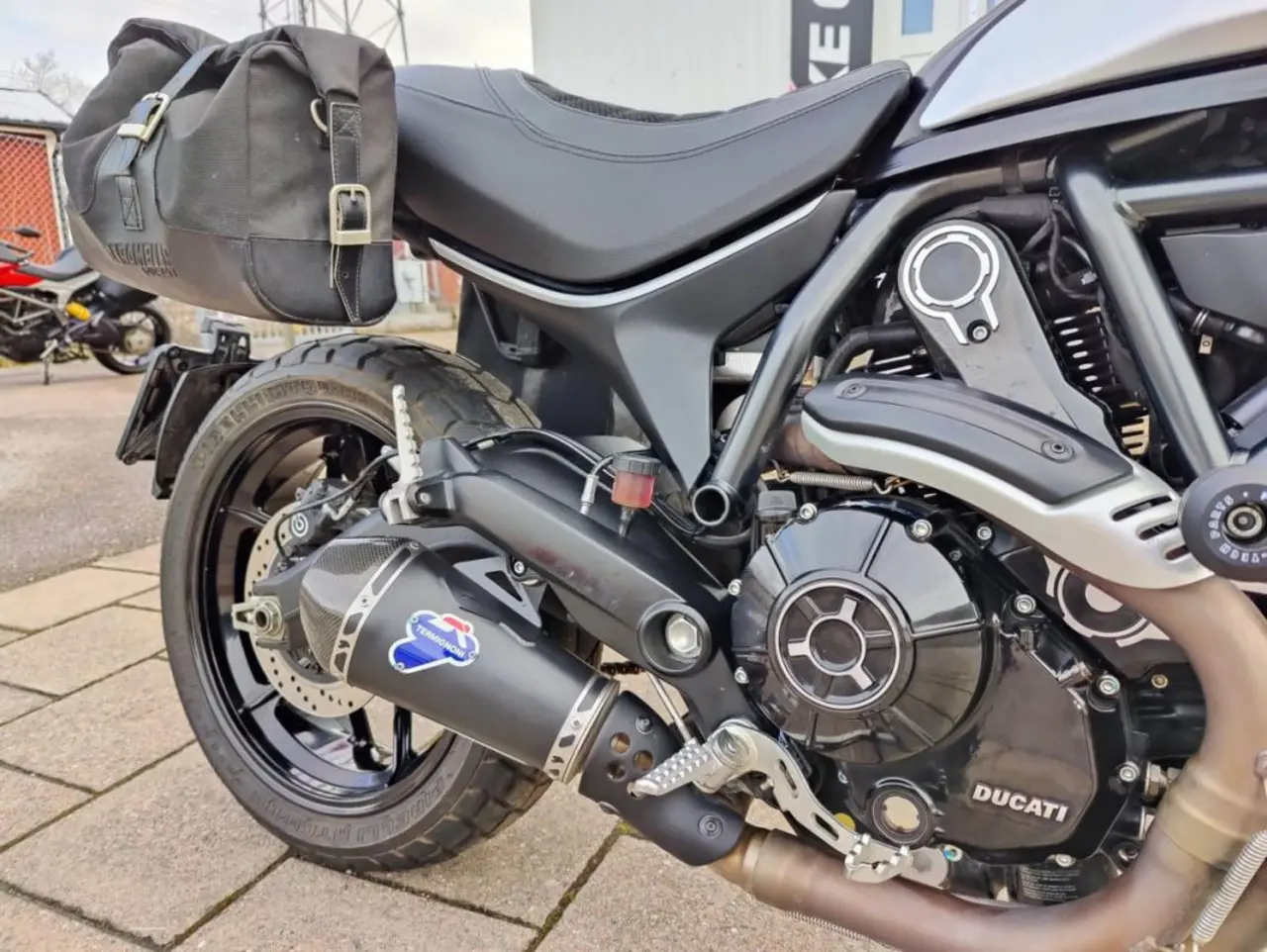 Den är utrustad med Ducatis sidoväskor med enkla och smidiga snabbfästen, samt underbart italienskt ljud från Termignoni avgassystem.