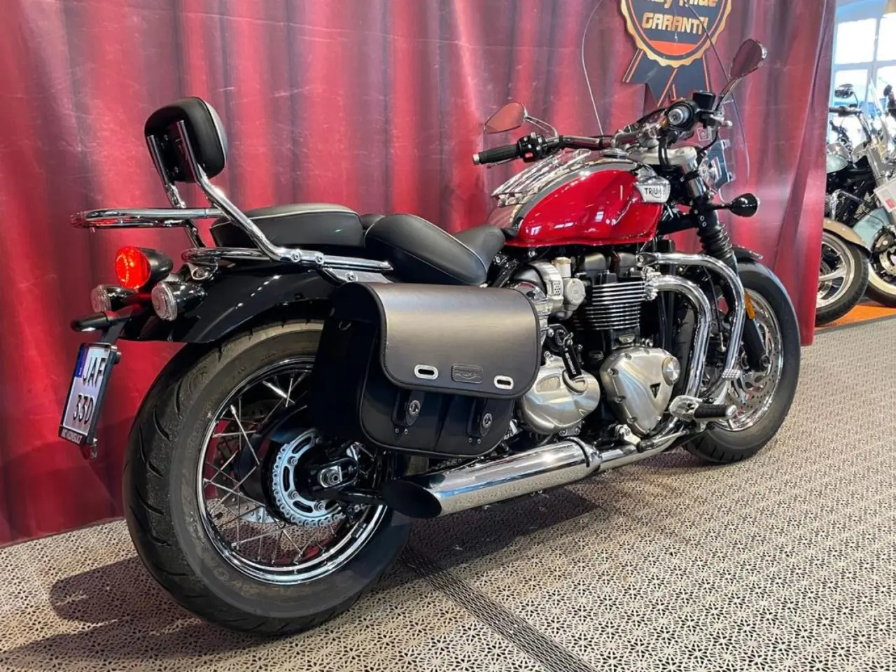 Bonneville Speedmaster Chrome Edition en Bobber med passagerardyna. 705mm sitthöjd. Endast 110 mil på mätaren. Extrautrustad med motorbågar, sidoväskor, ryggstöd med pakethållare, vindruta med snabbfäste, kromade sidopaneler. ABS. Farthållare. Riding Modes. En ägare. Första service är gjord. Fabriksgaranti till 2025-05-25