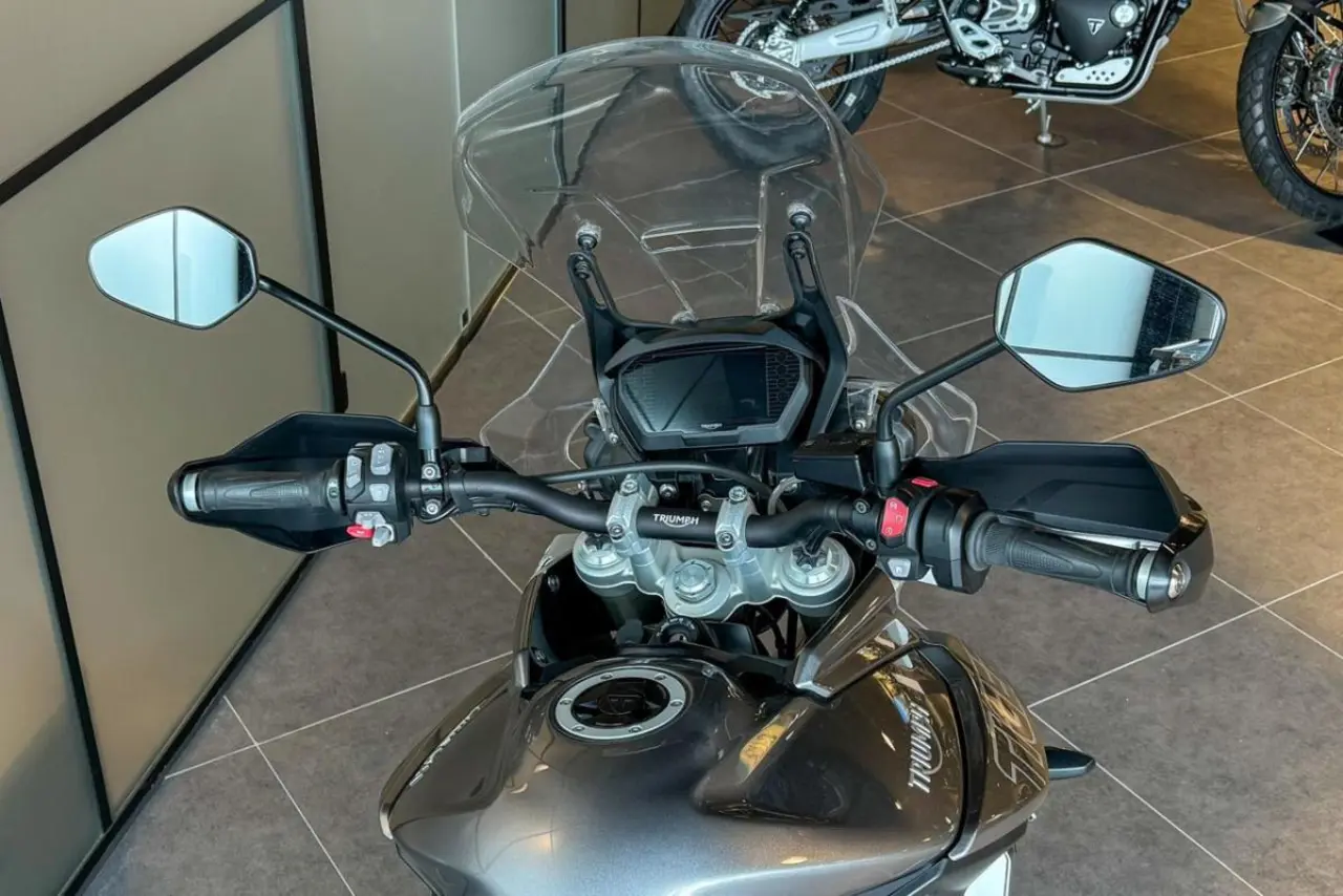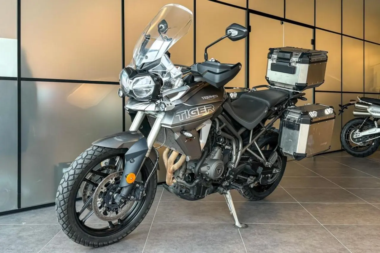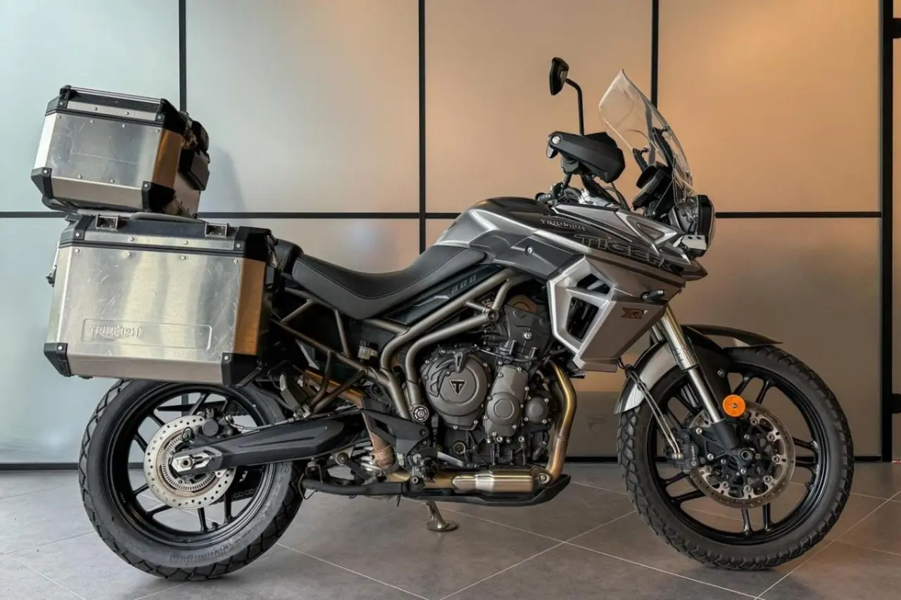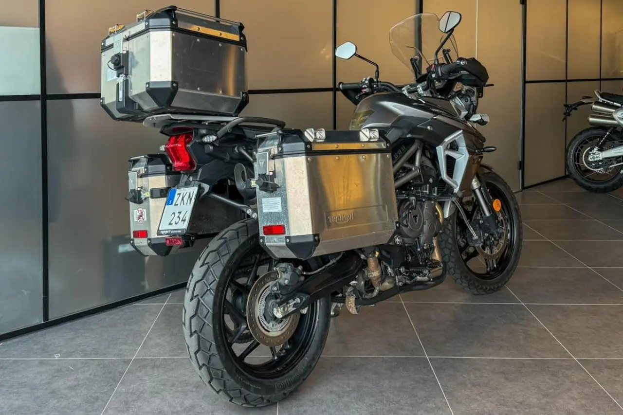 Triumph Tiger 800 XRt utrustad med bland annat sidoväskor, topbox, centralstöd, handtagsvärmare, handguards och farthållare.
