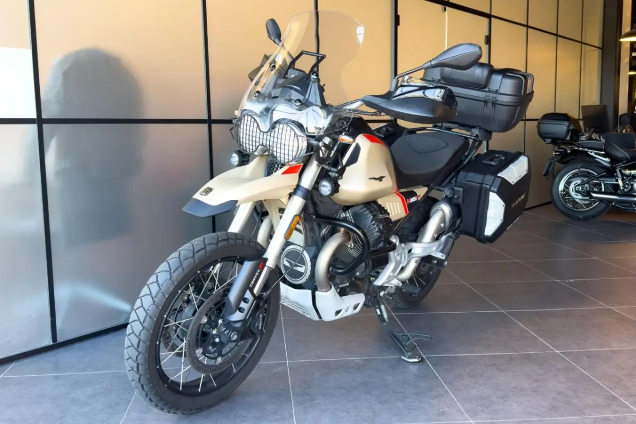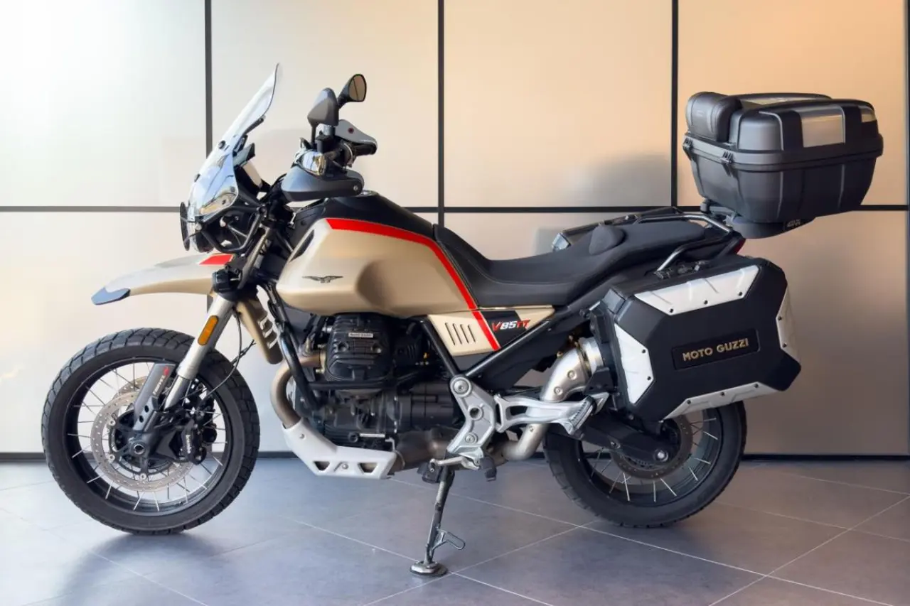 Moto Guzzi V85 TT utrustad med bland annat Öhlinsfjädring, sidoväskor, 52 liters toppbox, komfortsadel, farthållare, värmehandtag, lyktgaller, handguards, stag för gps/mobil-fäste bakom vindrutan och motorbågar från Hepco & Becker.