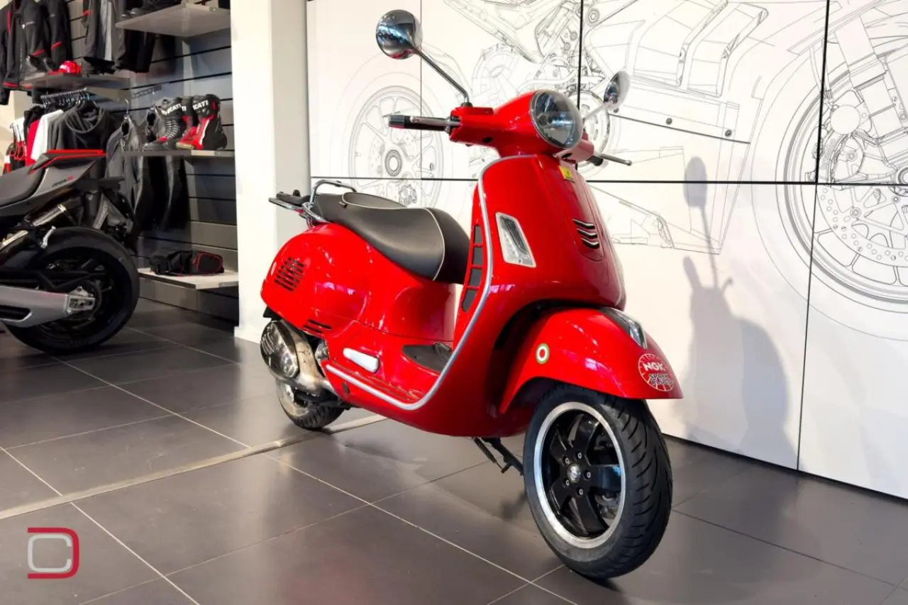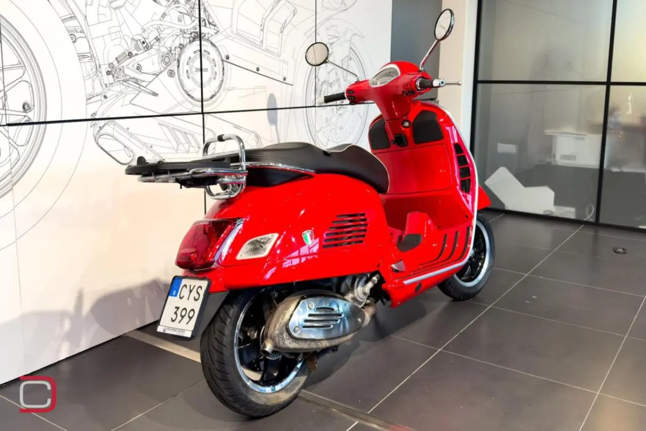 Piaggio Vespa 300 GTS i fin röd färg utrustad med pakethållare.