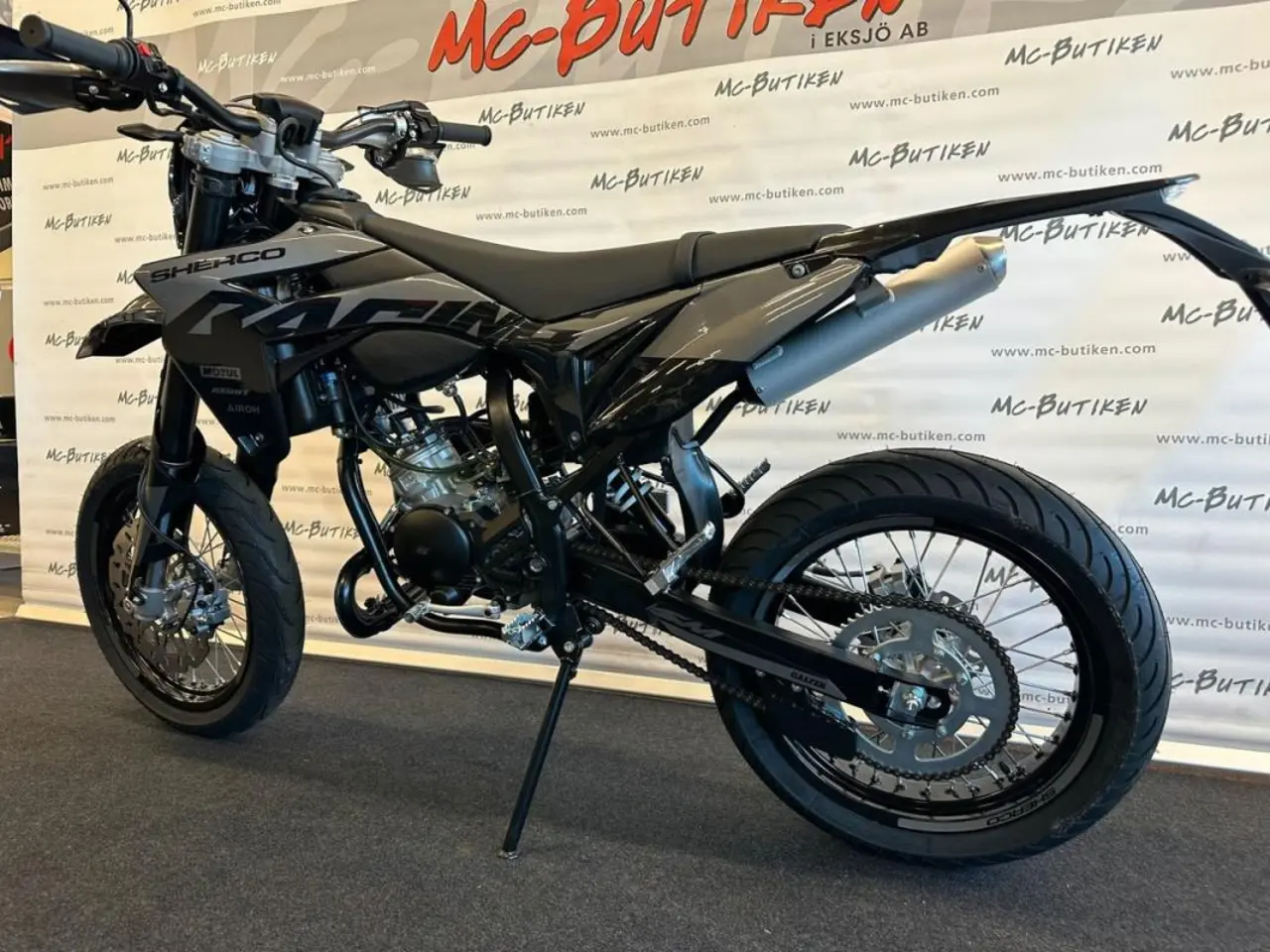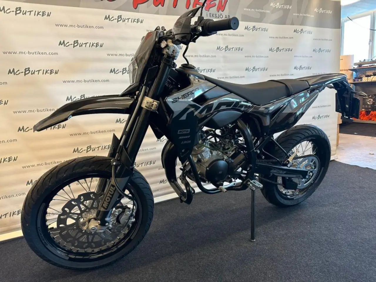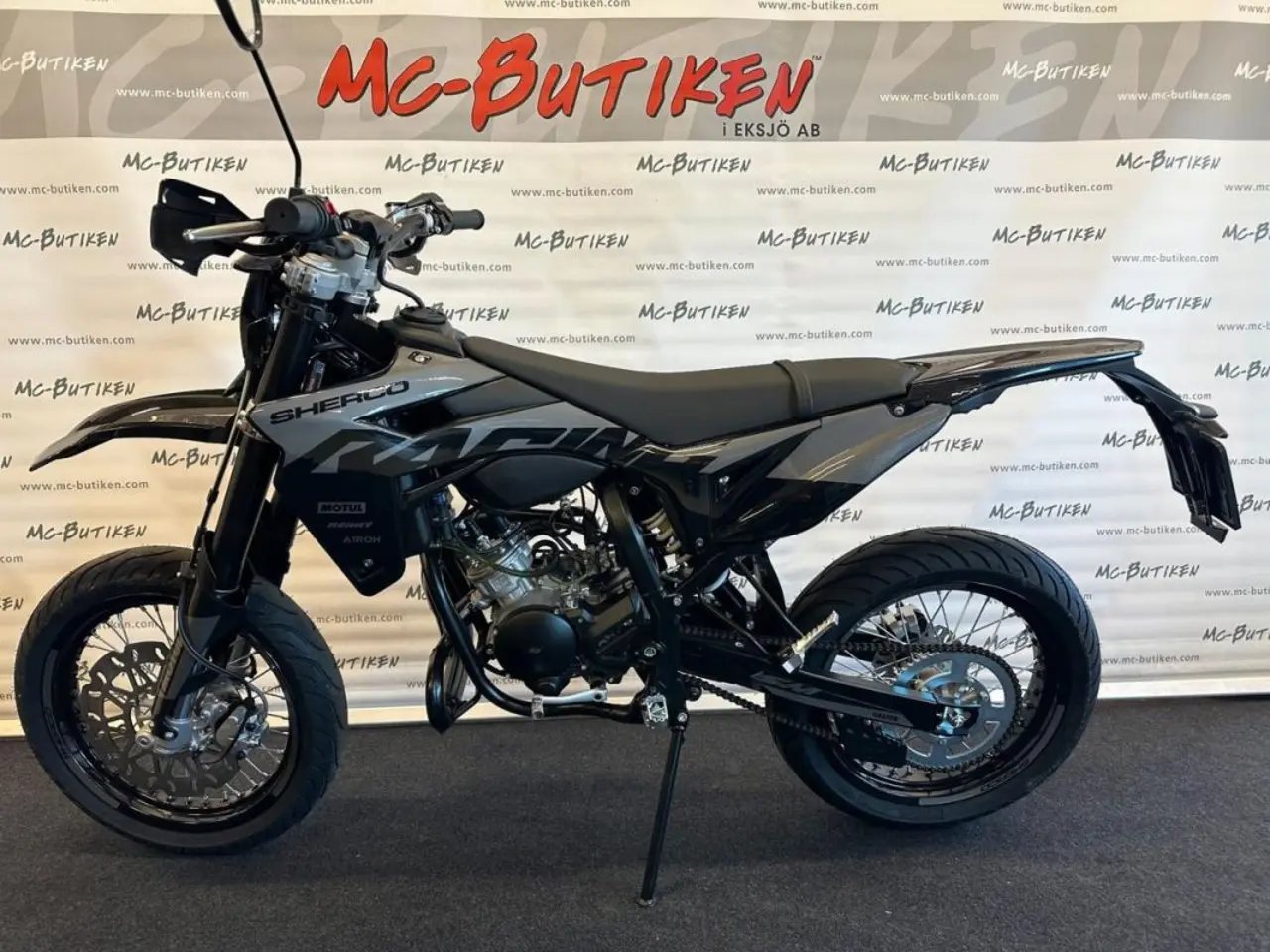50cc SuperMotard modell med 17" fälgar skodda med greppvänliga Michelin däck. Kraftfull 300mm bromsskiva fram och rejäl fjädringsväg. Driftsäker Minarelli AM6 motor med Vattenkylning och separat oljetank.