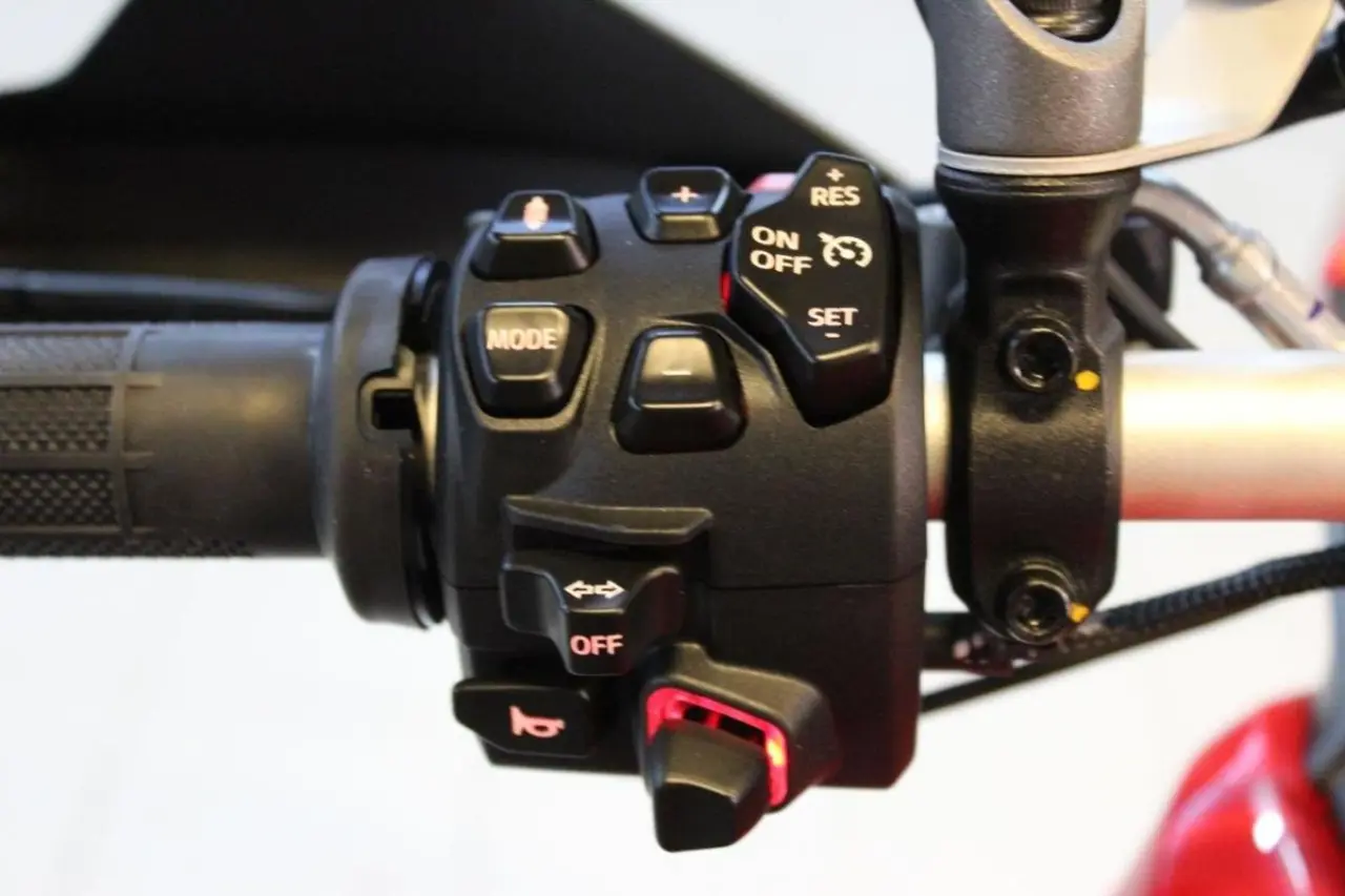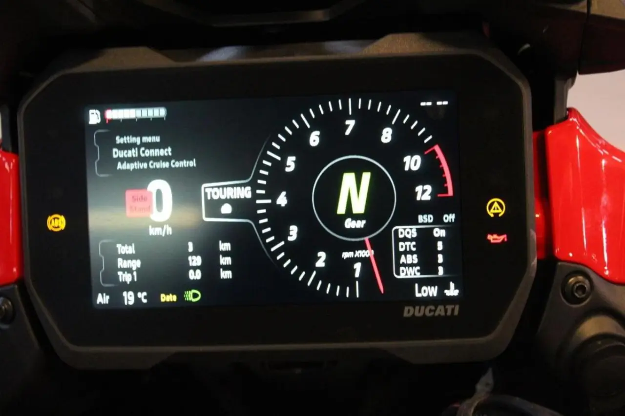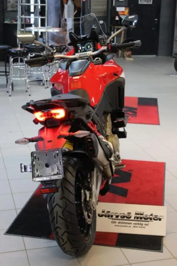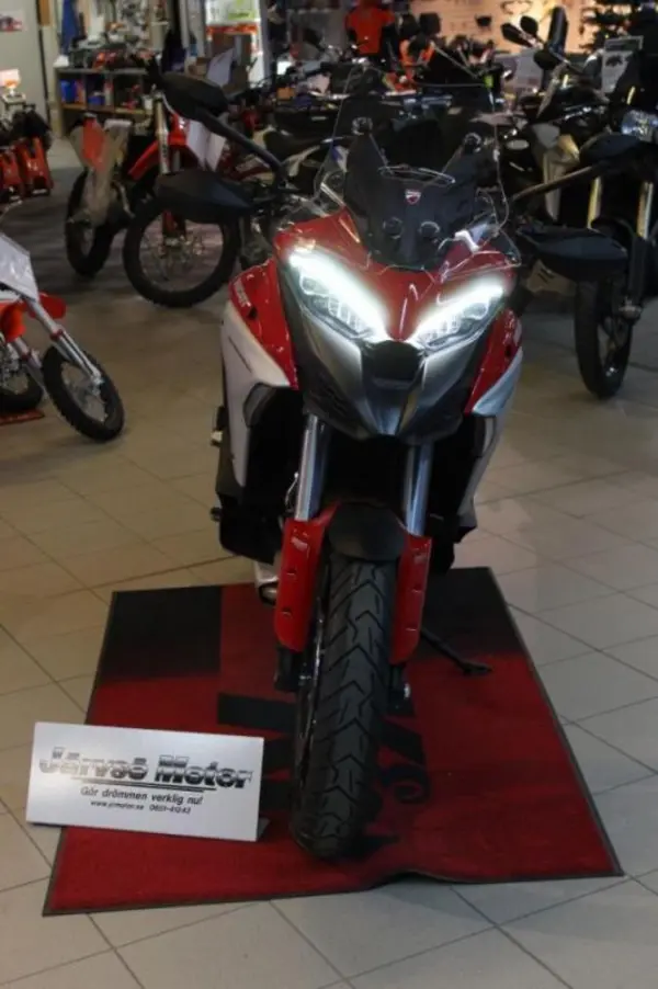 Ducati Multistrada V4S med Travel paket (Sidoväskor, värmehandtag & värmesadel) och Radar. Fjärdegenerationens Ducati Multistrada med en omarbetad V4-motor med 1158cc, 170hk. Längsta serviceintervallerna i branschen, hela 6 000 mil för ventilspelsjustering och 1 500 mil eller vartannat år för oljeservice. V4S:en har den större 6.5"m skärmen som med hjälp av Ducati Connect appen kan spegla telefonen till skärmen för en full GPS, spela musik eller hantera dina telefonkontakter, interaktionen sker då... via joysticken på vänster reglage. Telefonen kan förvaras i det vattentäta facket på tanken där även en USB-port för laddning finns. Ducatis elektroniska semi-aktiva skyhook fjädring har nu även auto level funktion som känner av lasten på motorcykeln och anpassar fjädringen efter den vikten. Rutan kan justeras med endast ett finger. Regnr:GFG89E.