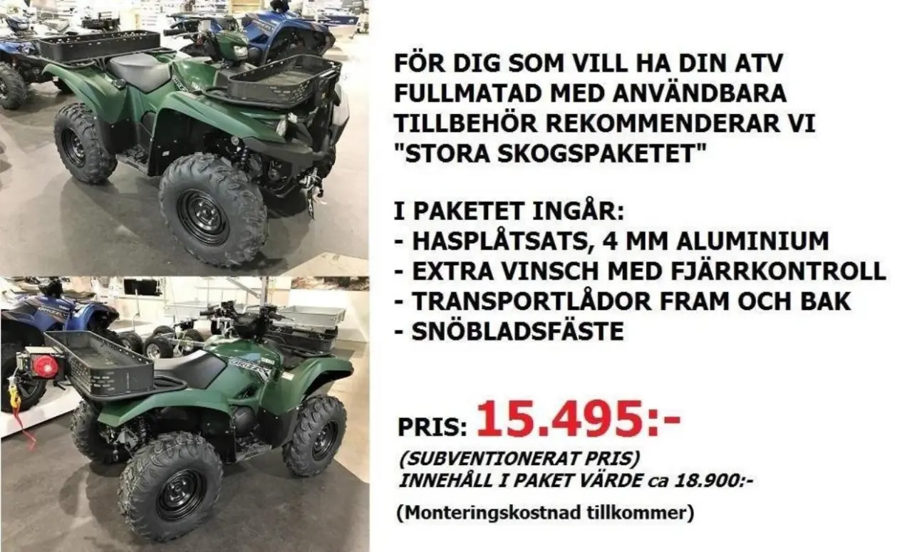 DENNA ANNONS GÄLLER ENDAST STORA SKOGSPAKETET SOM ÄR ETT TILLBEHÖR. MASKINEN PÅ BILDEN ÄR EN GRIZZLY 700 OCH KOSTAR CA 130.000:-. DETTA PAKET ÄR FÖR DIG SOM VILL UTÖKA DIN ATV.s ANVÄNDNINGSOMRÅDE. EXTRAUTRUSTA DIN KODIAK ELLER GRIZZLY 700 MED STORA SKOGSPAKETET OCH FÅ MED LÅDOR FRAM OCH BAK. EN ROBUST 4 MM TJOCK HASPLÅT. EN EXTRA FLYTTBAR VINSCH MED FJÄRRKONTROLL OCH ETT FÄSTE FÖR SNÖBLAD OM DU PLANERAR ATT PLOGA I VINTER.