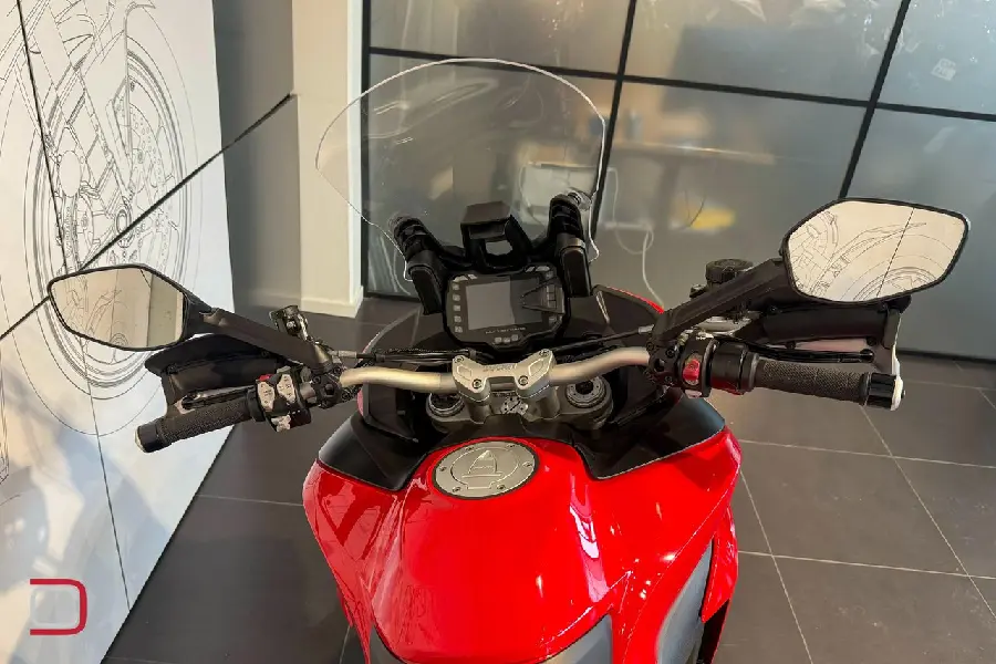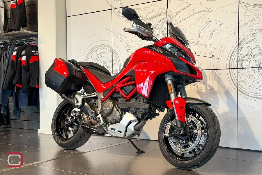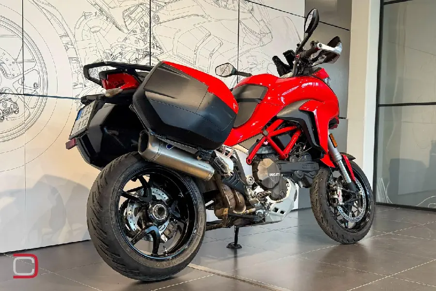 Ducati Multistrada 1200 S utrustad med bland annat Termignoni helsystem, sidoväskor, ABS, hasplåt, handguards, farthållare, justerbar ruta och centralstöd.