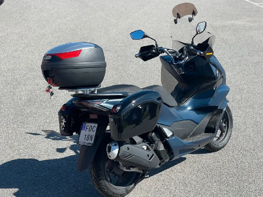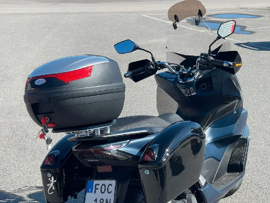 Det här är inte vilken PCX som helst – den är specialutrustad med sidoväskor som har inbyggt bromsljus, matchande topbox, hög vindruta, handskydd och stor förvaring under sadeln. Allt detta gör den till den perfekta pendlarhojen – smidig, bränslesnål och riktigt bekväm att köra, oavsett väder.