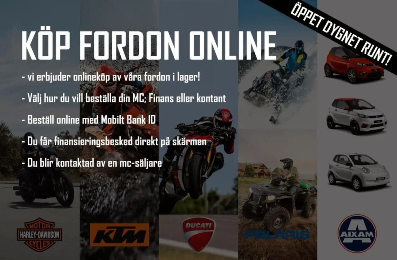 Järvsö Motor har det ni söker och lite till! Vi har mångårig erfarenhet inom området och vi tycker att den personliga kontakten är jätteviktig så gör som många andra runt om i landet och anlita oss på Järvsö Motor & nyttja vårt kostnadsfria boende i samband med affär och service. Ni kan även köpa alla våra fordon online och få ditt finansieringsbesked direkt på skärmen, Identifiera dig enkelt med mobilt bankId. Länk: https://https://www.jarvsomotor.se/info/kop-fordon-online/#/ JÄRVSÖ MOTOR KAN ORDNA FRAKT AV DIN NYA MOTORCYKEL HEM TILL DIG MED PERSONLIG LEVERANS & GENOMGÅNG AV HOJEN! Inom Sverige gäller även Gotland (Gäller ej vid inbyte)