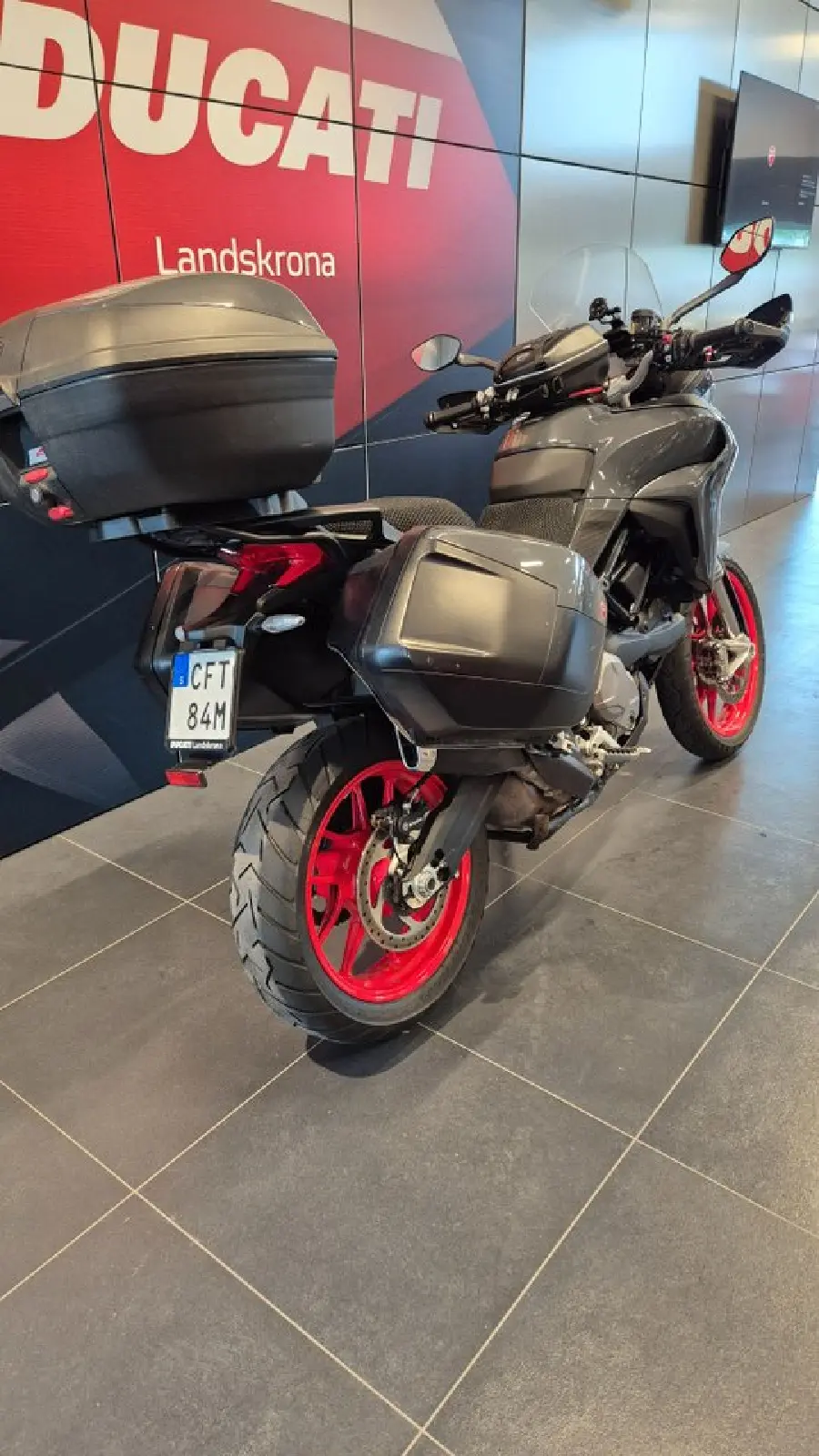 Ducati Multistrada V2 S som har rullat låga 1330 mil. Utrustad med TouringPack / Travel sidoväskor, handtagsvärmare Elektrisk fjädring Powermodes Ridemodes Kurv-ABS Engine Brake Control Brembo bromsar Ducati brake Light EVO Cruise Control DQS 2.0 19" Framhjul Skyhook fjädring ABS-bromsar TFT Display LED Strålkastare Ridingmodes Handskydd Väskhållare Ducati Traction Control (DTC) EVO Ducati Touring.