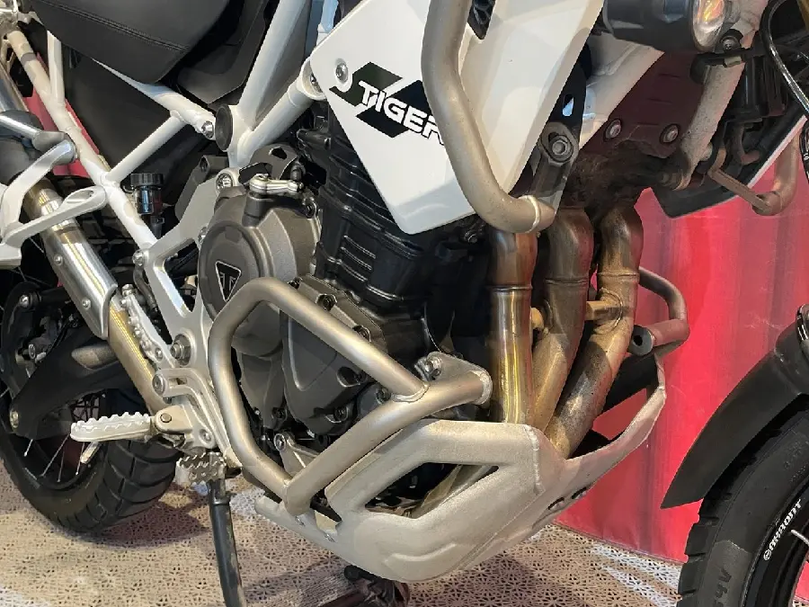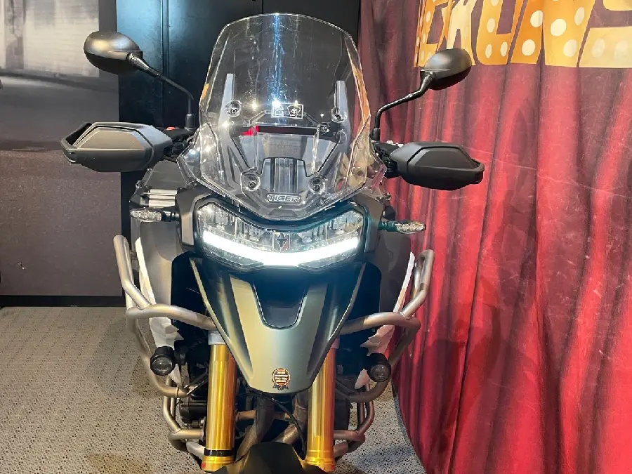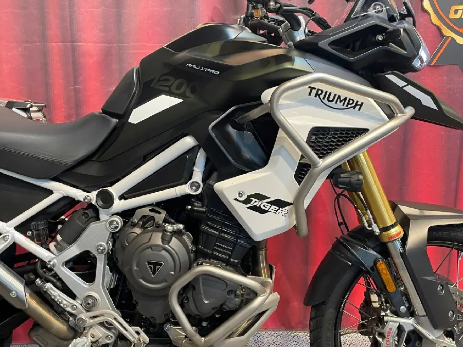 Tiger 1200 Rally Pro, förutom den omfattande standardutrustningen har denna värmedyna till föraren och övre skyddsbågar monterade.