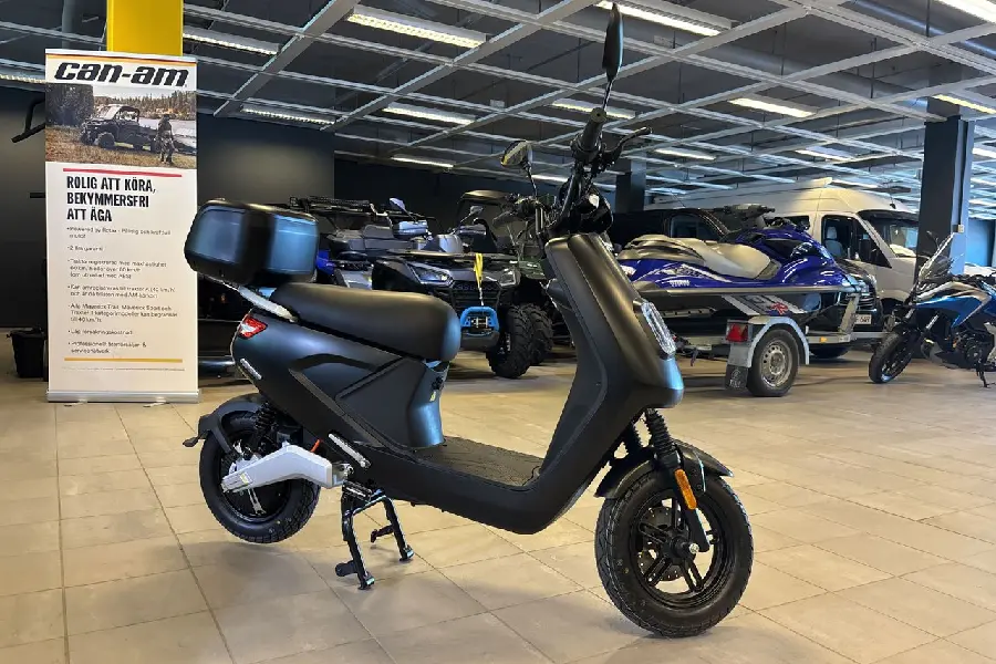 En riktigt kompakt och modern Mopedklass 1 45km/h elmoped. LED-strålkastare i fram med en egen signatur och stöldlarm. Den drivs av en 1440 W motor från marknadsledande Bosch. Batteri med en räckvidd på ca 50km går att plocka med sig för laddning eller ladda när det sitter kvar i mopeden. Som alla mopeder från LV finns plats för ett extra batteri som på denna modell ger dig en räckvidd på upp till 100 km (med 2 batterier). Maxfart: 45 km/timmen, Längd: 1700 mm, Bredd: 700 mm, Höjd: 1350 mm (1050 mm utan backspeglar), Sitthöjd: 780 mm, vikt: ca 67 kg med ett batteri, Däck: 10", Batteri: 48V 26Ah,... 3 års garanti (Även på batteriet), Effekt: 1440 W. Vi erbjuder finansiering genom Santander, Månadskostnad: 185:- med 20% kontantinsats, Vi tar de flesta fordon i inbyte, Vi kan även göra ett rent inköp om du endast vill sälja ditt fordon, Kontakta oss för mer information, Ring oss på 0702836416, Mail fordon@sama.nu, Välkommen!
