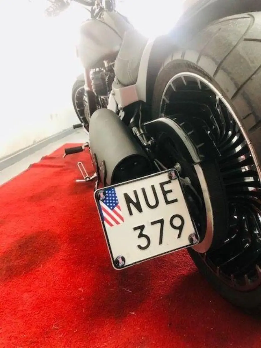 Thunderbike-bakskärm med integrerad belysning, Bassani-system, Turbin-fälgar, bytt styre, sidoflyttad skylt och liten svingarms-väska.