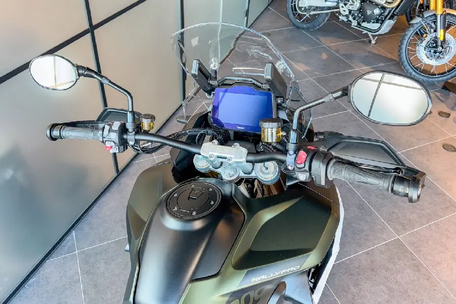 Tiger 1200 Rally Pro i mattgröna färgen utrustad med bland annat 2 st svarta sidoväskor, värmehandtag, centralstöd, quickshift, farthållare och blåtandsmodul.